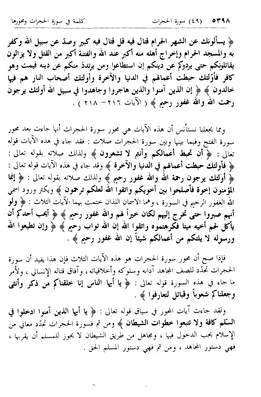 فإذا صح أن محور سورة الحجرات هو هذه الآيات الثلاث فإن هذا يفيد أن سورة الحجرات تحدّد للصف المجاهد آدابه وسلوكه وأخلاقياته، وآفاق قتاله الإنساني، ولأمر ما جاء في هذه السورة قوله تعالى: يا أَيُّهَا النَّاسُ إِنَّا خَلَقْناكُمْ مِنْ ذَكَرٍ وَأُنْثى وَجَعَلْناكُمْ شُعُوباً وَقَبائِلَ لِتَعارَفُوا.