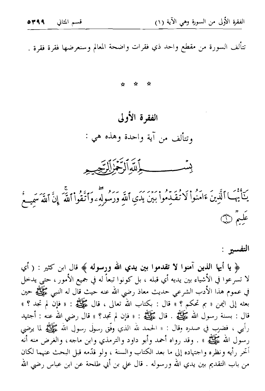 يا أَيُّهَا الَّذِينَ آمَنُوا لا تُقَدِّمُوا بَيْنَ يَدَيِ اللَّهِ وَرَسُولِهِ قال ابن كثير: (أي لا تسرعوا في الأشياء بين يديه أي قبله، بل كونوا تبعا له في جميع الأمور، حتى يدخل في عموم هذا الأدب الشرعي حديث معاذ رضي الله عنه حيث قال له النبي صلّى الله عليه وسلم حين بعثه إلى اليمن «بم تحكم؟» قال: بكتاب الله تعالى، قال صلّى الله عليه وسلم: «فإن لم تجد؟» قال: بسنة رسول الله صلّى الله عليه وسلم. قال صلّى الله عليه وسلم: «فإن لم تجد؟» قال رضي الله عنه: أجتهد رأيي، فضرب في صدره وقال: «الحمد لله الذي وفّق رسول رسول الله صلّى الله عليه وسلم لما يرضي رسول الله صلّى الله عليه وسلم». وقد رواه أحمد وأبو داود والترمذي وابن ماجه، والغرض منه أنه أخّر رأيه ونظره واجتهاده إلى ما بعد الكتاب والسنة، ولو قدّمه قبل البحث عنهما لكان من باب التقديم بين يدي الله ورسوله. قال علي بن أبي طلحة عن ابن عباس رضي الله