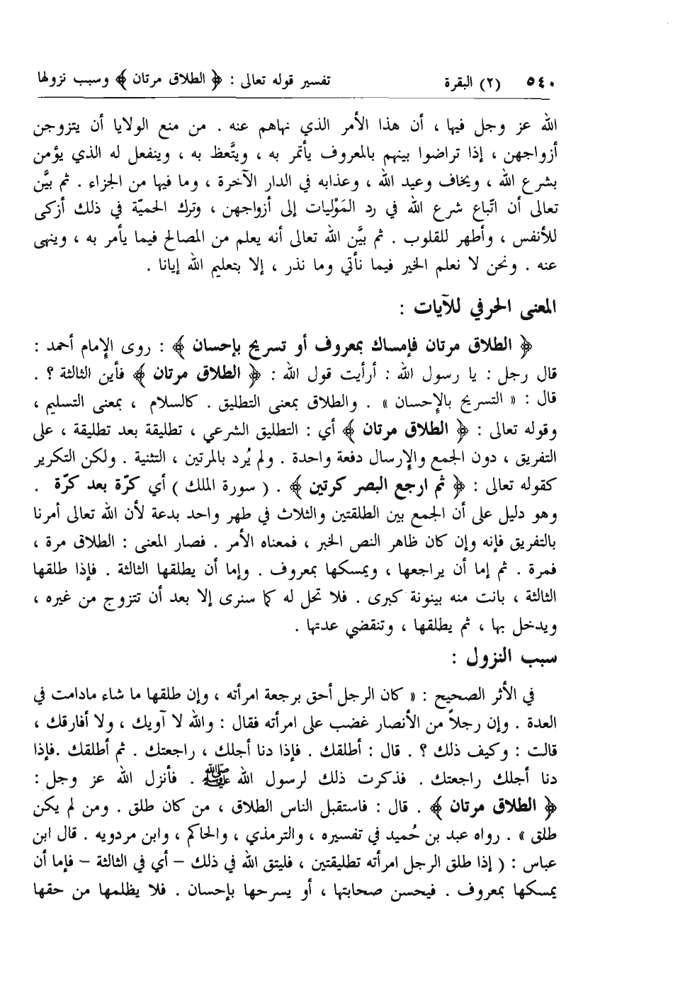 قال: «التسريح بالإحسان». والطلاق بمعنى التطليق. كالسلام، بمعنى التسليم، وقوله تعالى: الطَّلاقُ مَرَّتانِ أي: التطليق الشرعي، تطليقة بعد تطليقة، على التفريق، دون الجمع والإرسال دفعة واحدة. ولم يرد بالمرتين، التثنية. ولكن التكرير كقوله تعالى: ثُمَّ ارْجِعِ الْبَصَرَ كَرَّتَيْنِ. (سورة الملك) أي كرة بعد كرة.