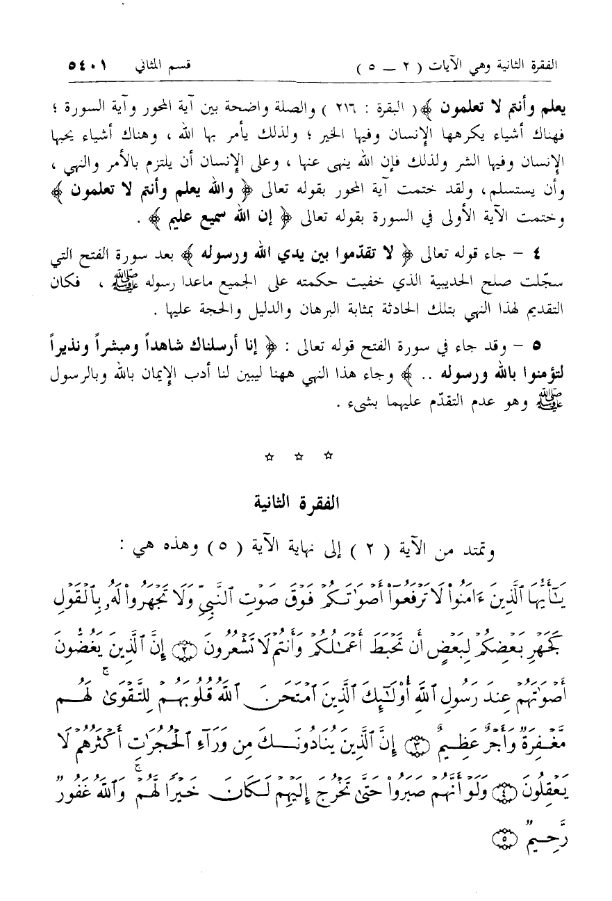 5 - وقد جاء في سورة الفتح قوله تعالى: إِنَّا أَرْسَلْناكَ شاهِداً وَمُبَشِّراً وَنَذِيراً لِتُؤْمِنُوا بِاللَّهِ وَرَسُولِهِ .. وجاء هذا النهي هاهنا ليبين لنا أدب الإيمان بالله وبالرسول صلّى الله عليه وسلم وهو عدم التقدّم عليهما بشيء.