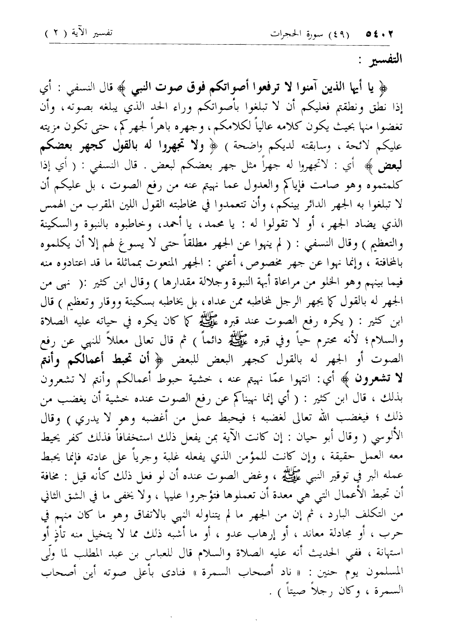 يا أَيُّهَا الَّذِينَ آمَنُوا لا تَرْفَعُوا أَصْواتَكُمْ فَوْقَ صَوْتِ النَّبِيِّ قال النسفي: أي إذا نطق ونطقتم فعليكم أن لا تبلغوا بأصواتكم وراء الحد الذي يبلغه بصوته، وأن تغضوا منها بحيث يكون كلامه عاليا لكلامكم، وجهره باهرا لجهركم، حتى تكون مزيته عليكم لائحة، وسابقته لديكم واضحة) وَلا تَجْهَرُوا لَهُ بِالْقَوْلِ كَجَهْرِ بَعْضِكُمْ لِبَعْضٍ أي: لا تجهروا له جهرا مثل جهر بعضكم لبعض. قال النسفي: (أي إذا كلمتموه وهو صامت فإياكم والعدول عما نهيتم عنه من رفع الصوت، بل عليكم أن لا تبلغوا به الجهر الدائر بينكم، وأن تتعمدوا في مخاطبته القول اللين المقرب من الهمس الذي يضاد الجهر، أو لا تقولوا له: يا محمد، يا أحمد، وخاطبوه بالنبوة والسكينة والتعظيم) وقال النسفي: (لم ينهوا عن الجهر مطلقا حتى لا يسوغ لهم إلا أن يكلموه بالمخافتة، وإنما نهوا عن جهر مخصوص، أعني: الجهر المنعوت بمماثلة ما قد اعتادوه منه فيما بينهم وهو الخلو من مراعاة أبهة النبوة وجلالة مقدارها) وقال ابن كثير: (نهى من الجهر له بالقول كما يجهر الرجل لمخاطبه ممن عداه، بل يخاطبه بسكينة ووقار وتعظيم) قال ابن كثير: (يكره رفع الصوت عند قبره صلّى الله عليه وسلم كما كان يكره في حياته عليه الصلاة والسلام؛ لأنه محترم حيا وفي قبره صلّى الله عليه وسلم دائما) ثم قال تعالى معللا للنهي عن رفع الصوت أو الجهر له بالقول كجهر البعض للبعض أَنْ تَحْبَطَ أَعْمالُكُمْ وَأَنْتُمْ لا تَشْعُرُونَ أي: انتهوا عمّا نهيتم عنه، خشية حبوط أعمالكم وأنتم لا تشعرون بذلك، قال ابن كثير: (أي إنما نهيناكم عن رفع الصوت عنده خشية أن يغضب من ذلك؛ فيغضب الله تعالى لغضبه؛ فيحبط عمل من أغضبه وهو لا يدري) وقال الألوسي (وقال أبو حيان: إن كانت الآية بمن يفعل ذلك استخفافا فذلك كفر يحيط معه العمل حقيقة، وإن كانت للمؤمن الذي يفعله غلبة وجريا على عادته فإنما يحبط عمله البر في توقير النبي صلّى الله عليه وسلم، وغض الصوت عنده أن لو فعل ذلك كأنه قيل: مخافة أن تحبط الأعمال التي هي معدة أن تعملوها فتؤجروا عليها، ولا يخفى ما في الشق الثاني من التكلف البارد، ثم إن من الجهر ما لم يتناوله النهي بالاتفاق وهو ما كان منهم في حرب، أو مجادلة معاند، أو إرهاب عدو، أو ما أشبه ذلك مما لا يتخيل منه تأذ أو استهانة، ففي الحديث أنه عليه الصلاة والسلام قال للعباس بن عبد المطلب لما ولّى المسلمون يوم حنين: «ناد أصحاب السمرة» فنادى بأعلى صوته أين أصحاب السمرة، وكان رجلا صيتا).