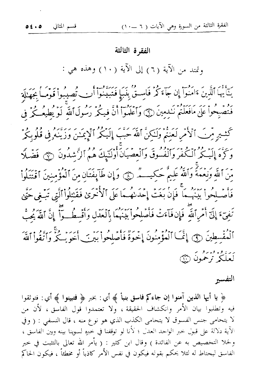 يا أَيُّهَا الَّذِينَ آمَنُوا إِنْ جاءَكُمْ فاسِقٌ بِنَبَإٍ أي: بخبر فَتَبَيَّنُوا أي: فتوثقوا فيه وتطلبوا بيان الأمر وانكشاف الحقيقة، ولا تعتمدوا قول الفاسق، لأن من لا يتحامى جنس الفسوق لا يتحامى الكذب الذي هو نوع منه، قال النسفي: (وفي الآية دلالة على قبول خبر الواحد العدل؛ لأنا لو توقفنا في خبره لسوينا بينه وبين الفاسق، ولخلا التخصيص به عن الفائدة) وقال ابن كثير: (يأمر الله تعالى بالتثبت في خبر الفاسق ليحتاط له لئلا يحكم بقوله فيكون في نفس الأمر كاذبا أو مخطئا، فيكون الحاكم