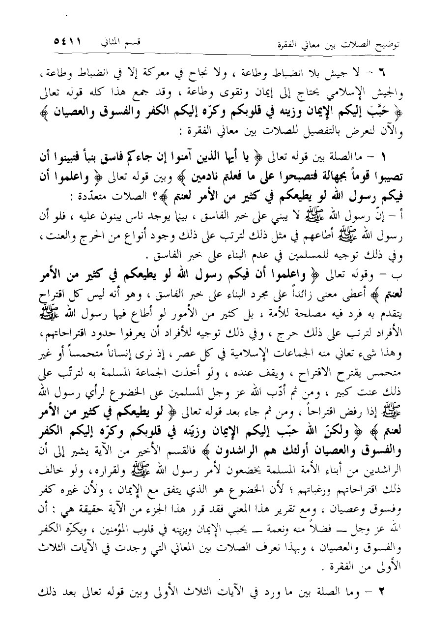 ب- وقوله تعالى وَاعْلَمُوا أَنَّ فِيكُمْ رَسُولَ اللَّهِ لَوْ يُطِيعُكُمْ فِي كَثِيرٍ مِنَ الْأَمْرِ لَعَنِتُّمْ أعطى معنى زائدا على مجرد البناء على خبر الفاسق، وهو أنه ليس كل اقتراح يتقدم به فرد فيه مصلحة للأمة، بل كثير من الأمور لو أطاع فيها رسول الله صلّى الله عليه وسلم الأفراد لترتب على ذلك حرج، وفي ذلك توجيه للأفراد أن يعرفوا حدود اقتراحاتهم، وهذا شئ تعاني منه الجماعات الإسلامية في كل عصر، إذ نرى إنسانا متحمسا أو غير متحمس يقترح الاقتراح، ويقف عنده، ولو أخذت الجماعة المسلمة به لترتّب على ذلك عنت كبير، ومن ثم أدّب الله عزّ وجل المسلمين على الخضوع لرأي رسول الله صلّى الله عليه وسلم إذا رفض اقتراحا، ومن ثم جاء بعد قوله تعالى لَوْ يُطِيعُكُمْ فِي كَثِيرٍ مِنَ الْأَمْرِ لَعَنِتُّمْ وَلكِنَّ اللَّهَ حَبَّبَ إِلَيْكُمُ الْإِيمانَ وَزَيَّنَهُ فِي قُلُوبِكُمْ وَكَرَّهَ إِلَيْكُمُ الْكُفْرَ وَالْفُسُوقَ وَالْعِصْيانَ أُولئِكَ هُمُ الرَّاشِدُونَ فالقسم الأخير من الآية يشير إلى أن الراشدين من أبناء الأمة المسلمة يخضعون لأمر رسول الله صلّى الله عليه وسلم ولقراره، ولو خالف ذلك اقتراحاتهم، ورغباتهم؛ لأن الخضوع هو الذي يتفق مع الإيمان، ولأن غيره كفر وفسوق وعصيان، ومع تقرير هذا المعنى فقد قرر هذا الجزء من الآية حقيقة هي: أن الله عزّ وجل- فضلا منه ونعمة- يحبب الإيمان ويزينه في قلوب المؤمنين، ويكرّه الكفر والفسوق والعصيان، وبهذا نعرف الصلات بين المعاني التي وجدت في الآيات الثلاث الأولى من الفقرة.