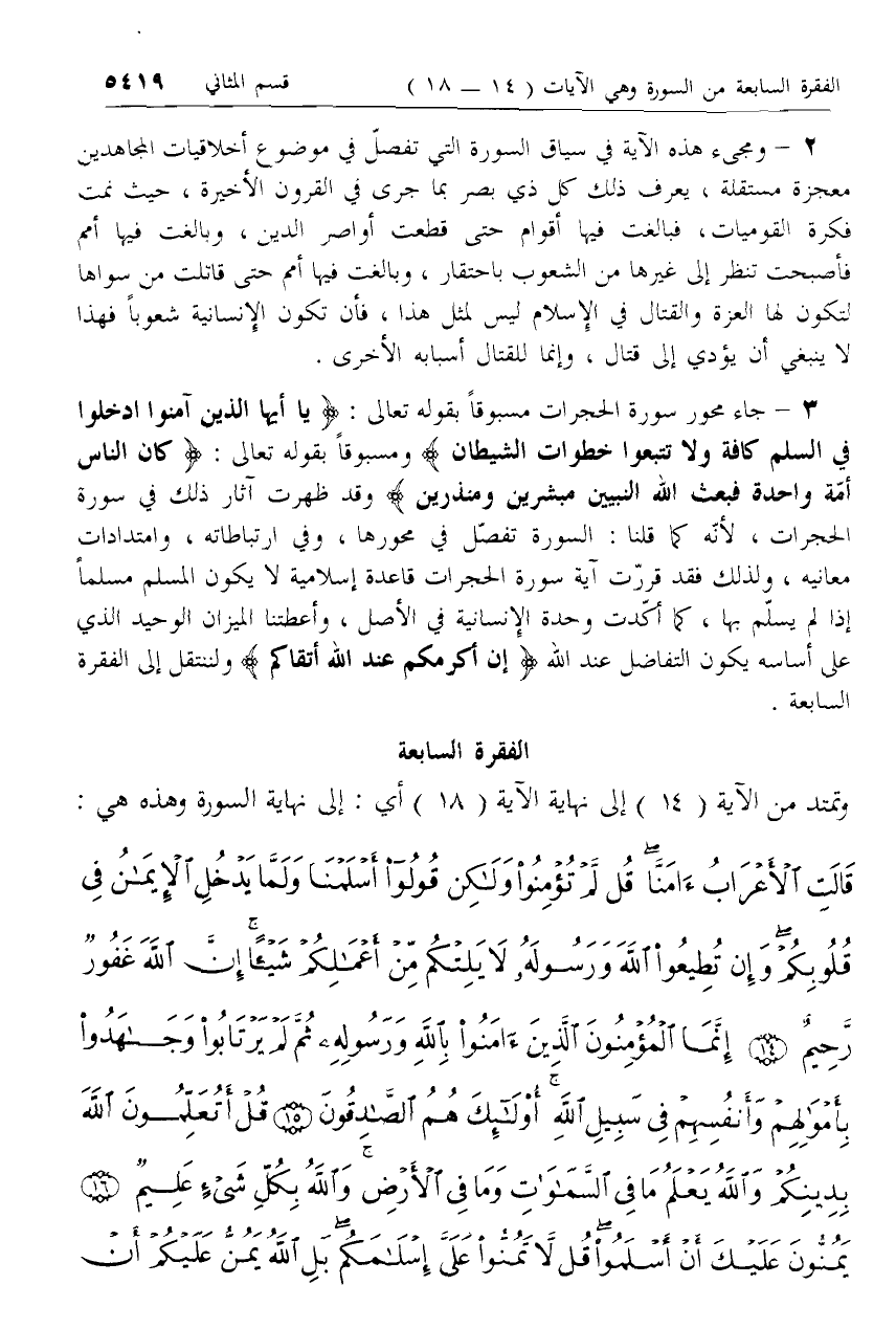 3 - جاء محور سورة الحجرات مسبوقا بقوله تعالى: يا أَيُّهَا الَّذِينَ آمَنُوا ادْخُلُوا فِي السِّلْمِ كَافَّةً وَلا تَتَّبِعُوا خُطُواتِ الشَّيْطانِ ومسبوقا بقوله تعالى: كانَ النَّاسُ أُمَّةً واحِدَةً فَبَعَثَ اللَّهُ النَّبِيِّينَ مُبَشِّرِينَ وَمُنْذِرِينَ وقد ظهرت آثار ذلك في سورة الحجرات، لأنّه كما قلنا: السورة تفصّل في محورها، وفي ارتباطاته، وامتدادات معانيه، ولذلك فقد قرّرت آية سورة الحجرات قاعدة إسلامية لا يكون المسلم مسلما إذا لم يسلّم بها، كما أكّدت وحدة الإنسانية في الأصل، وأعطتنا الميزان الوحيد الذي على أساسه يكون التفاضل عند الله إِنَّ أَكْرَمَكُمْ عِنْدَ اللَّهِ أَتْقاكُمْ ولننتقل إلى الفقرة السابعة.