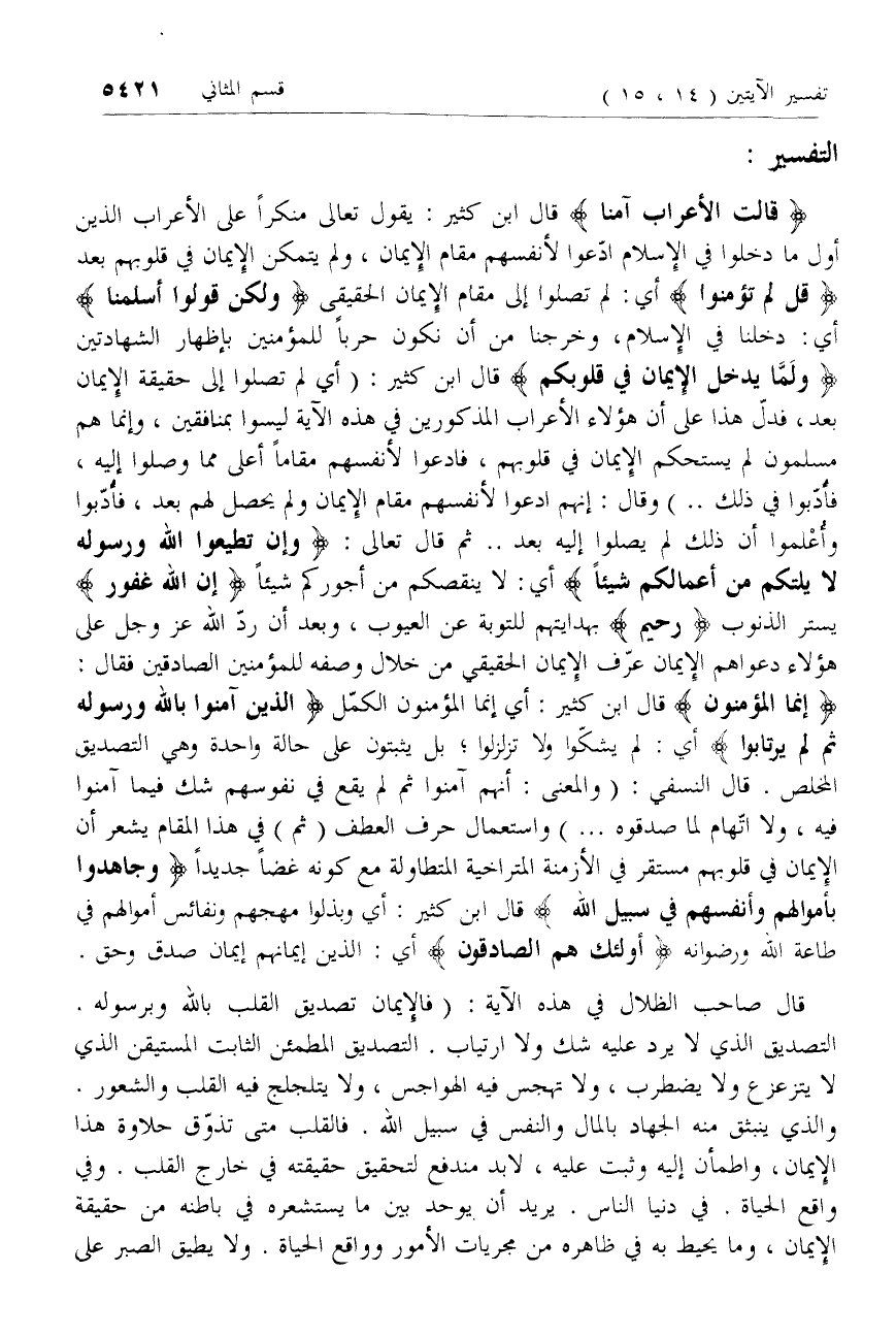 قالَتِ الْأَعْرابُ آمَنَّا قال ابن كثير: يقول تعالى منكرا على الأعراب الذين أول ما دخلوا في الإسلام ادّعوا لأنفسهم مقام الإيمان، ولم يتمكن الإيمان في قلوبهم بعد قُلْ لَمْ تُؤْمِنُوا أي: لم تصلوا إلى مقام الإيمان الحقيقى وَلكِنْ قُولُوا أَسْلَمْنا أي: دخلنا في الإسلام، وخرجنا من أن نكون حربا للمؤمنين بإظهار الشهادتين وَلَمَّا يَدْخُلِ الْإِيمانُ فِي قُلُوبِكُمْ قال ابن كثير: (أي لم تصلوا إلى حقيقة الإيمان بعد، فدلّ هذا على أن هؤلاء الأعراب المذكورين في هذه الآية ليسوا بمنافقين، وإنما هم مسلمون لم يستحكم الإيمان في قلوبهم، فادعوا لأنفسهم مقاما أعلى مما وصلوا إليه، فأدّبوا في ذلك .. ) وقال: إنهم ادعوا لأنفسهم مقام الإيمان ولم يحصل لهم بعد، فأدّبوا وأعلموا أن ذلك لم يصلوا إليه بعد .. ثم قال تعالى: وَإِنْ تُطِيعُوا اللَّهَ وَرَسُولَهُ لا يَلِتْكُمْ مِنْ أَعْمالِكُمْ شَيْئاً أي: لا ينقصكم من أجوركم شيئا إِنَّ اللَّهَ غَفُورٌ يستر الذنوب رَحِيمٌ بهدايتهم للتوبة عن العيوب،