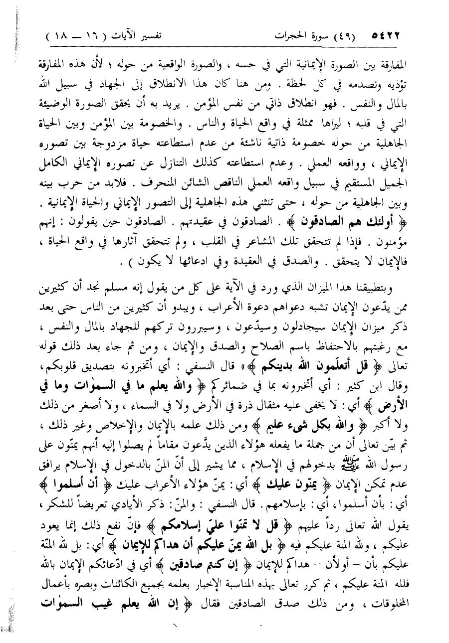 وبتطبيقنا هذا الميزان الذي ورد في الآية على كل من يقول إنه مسلم نجد أن كثيرين ممن يدّعون الإيمان تشبه دعواهم دعوة الأعراب، ويبدو أن كثيرين من الناس حتى بعد ذكر ميزان الإيمان سيجادلون وسيدّعون، وسيبررون تركهم للجهاد بالمال والنفس، مع رغبتهم بالاحتفاظ باسم الصلاح والصدق والإيمان، ومن ثم جاء بعد ذلك قوله تعالى