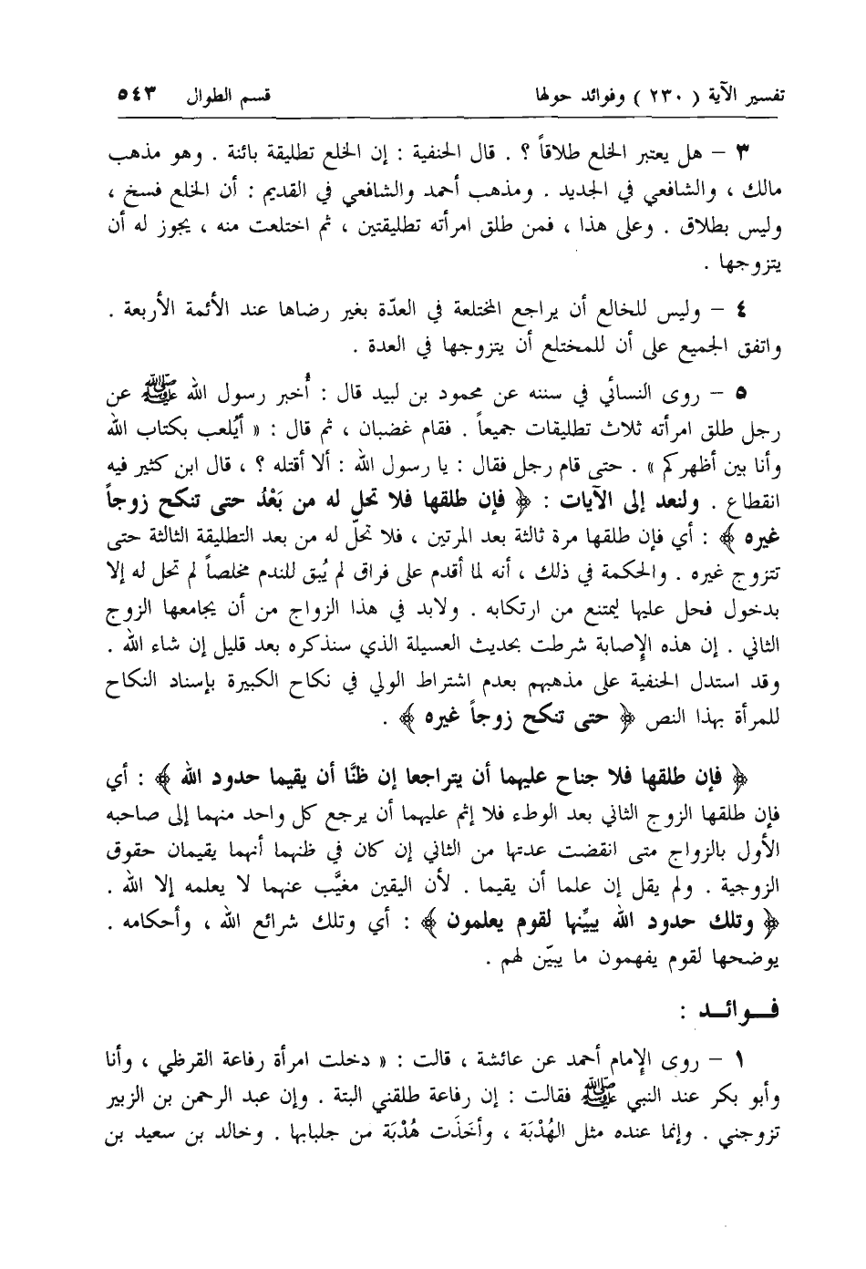 فَإِنْ طَلَّقَها فَلا تَحِلُّ لَهُ مِنْ بَعْدُ حَتَّى تَنْكِحَ زَوْجاً غَيْرَهُ: أي فإن طلقها مرة ثالثة بعد المرتين، فلا تحل له من بعد التطليقة الثالثة حتى تتزوج غيره. والحكمة في ذلك، أنه لما أقدم على فراق لم يبق للندم مخلصا لم تحل له إلا بدخول فحل عليها ليمتنع من ارتكابه. ولا بد في هذا الزواج من أن يجامعها الزوج الثاني. إن هذه الإصابة شرطت بحديث العسيلة الذي سنذكره بعد قليل إن شاء الله.