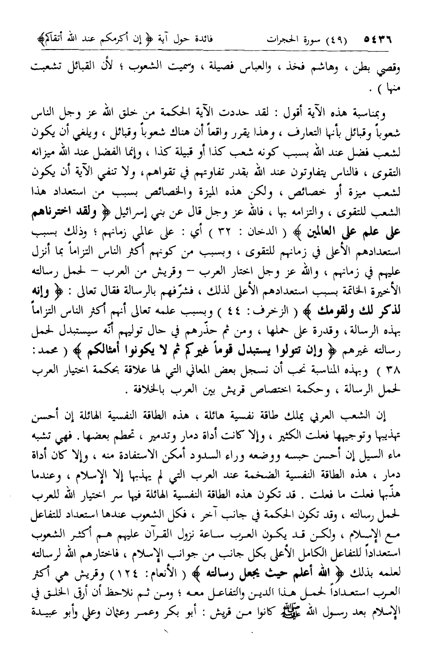 وبمناسبة هذه الآية أقول: لقد حددت الآية الحكمة من خلق الله عزّ وجل الناس شعوبا وقبائل بأنها التعارف، وهذا يقرر واقعا أن هناك شعوبا وقبائل، ويلغي أن يكون لشعب فضل عند الله بسبب كونه شعب كذا أو قبيلة كذا، وإنما الفضل عند الله ميزانه التقوى، فالناس يتفاوتون عند الله بقدر تفاوتهم في تقواهم، ولا تنفي الآية أن يكون لشعب ميزة أو خصائص، ولكن هذه الميزة والخصائص بسبب من استعداد هذا الشعب للتقوى، والتزامه بها، فالله عزّ وجل قال عن بني إسرائيل وَلَقَدِ اخْتَرْناهُمْ عَلى عِلْمٍ عَلَى الْعالَمِينَ (الدخان: 32) أي: على عالمي زمانهم؛ وذلك بسبب استعدادهم الأعلى في زمانهم للتقوى، وبسبب من كونهم أكثر الناس التزاما بما أنزل عليهم في زمانهم، والله عزّ وجل اختار العرب- وقريش من العرب- لحمل رسالته الأخيرة الخاتمة بسبب استعدادهم الأعلى لذلك، فشرّفهم بالرسالة فقال تعالى: وَإِنَّهُ لَذِكْرٌ لَكَ وَلِقَوْمِكَ (الزخرف: 44) وبسبب علمه تعالى أنهم أكثر الناس التزاما بهذه الرسالة، وقدرة على حملها، ومن ثم حذّرهم في حال توليهم أنّه سيستبدل لحمل رسالته غيرهم وَإِنْ تَتَوَلَّوْا يَسْتَبْدِلْ قَوْماً غَيْرَكُمْ ثُمَّ لا يَكُونُوا أَمْثالَكُمْ (محمد: