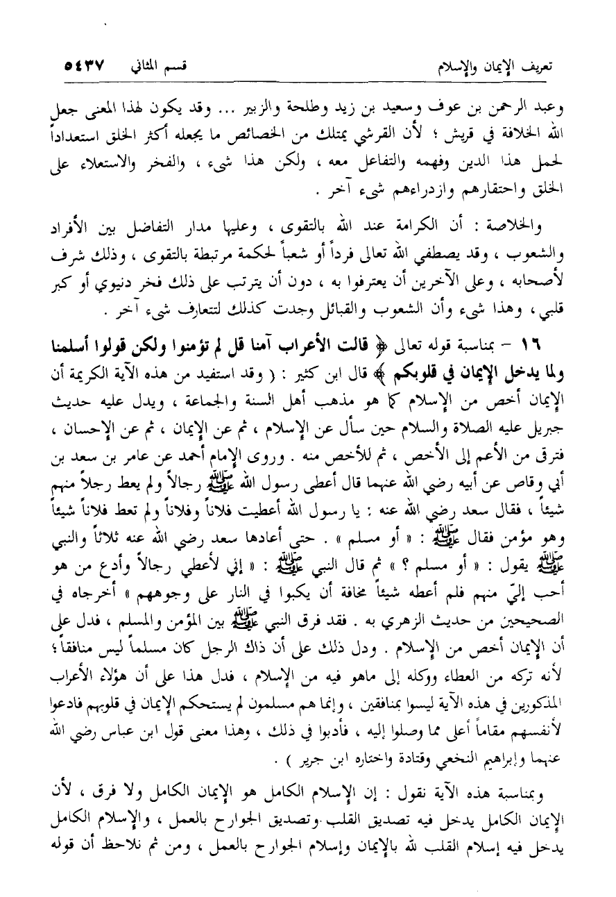 بمناسبة قوله تعالى قالَتِ الْأَعْرابُ آمَنَّا قُلْ لَمْ تُؤْمِنُوا وَلكِنْ قُولُوا أَسْلَمْنا وَلَمَّا يَدْخُلِ الْإِيمانُ فِي قُلُوبِكُمْ قال ابن كثير: (وقد استفيد من هذه الآية الكريمة أن الإيمان أخص من الإسلام كما هو مذهب أهل السنة والجماعة، ويدل عليه حديث جبريل عليه الصلاة والسلام حين سأل عن الإسلام، ثم عن الإيمان، ثم عن الإحسان، فترقى من الأعم إلى الأخص، ثم للأخص منه. وروى الإمام أحمد عن عامر بن سعد بن أبي وقاص عن أبيه رضي الله عنهما قال أعطى رسول الله صلّى الله عليه وسلم رجالا ولم يعط رجلا منهم شيئا، فقال سعد رضي الله عنه: يا رسول الله أعطيت فلانا وفلانا ولم تعط فلانا شيئا وهو مؤمن فقال صلّى الله عليه وسلم: «أو مسلم». حتى أعادها سعد رضي الله عنه ثلاثا والنبي صلّى الله عليه وسلم يقول: «أو مسلم؟» ثم قال النبي صلّى الله عليه وسلم: «إني لأعطي رجالا وأدع من هو أحب إليّ منهم فلم أعطه شيئا مخافة أن يكبوا في النار على وجوههم» أخرجاه في الصحيحين من حديث الزهري به. فقد فرق النبي صلّى الله عليه وسلم بين المؤمن والمسلم، فدل على أن الإيمان أخص من الإسلام. ودل ذلك على أن ذاك الرجل كان مسلما ليس منافقا؛ لأنه تركه من العطاء ووكله إلى ما هو فيه من الإسلام، فدل هذا على أن هؤلاء الأعراب المذكورين في هذه الآية ليسوا بمنافقين، وإنما هم مسلمون لم يستحكم الإيمان في قلوبهم فادعوا لأنفسهم مقاما أعلى مما وصلوا إليه، فأدبوا في ذلك، وهذا معنى قول ابن عباس رضي الله عنهما وإبراهيم النخعي وقتادة واختاره ابن جرير).