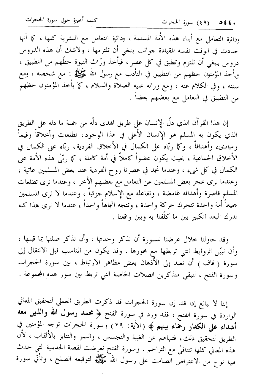 ودائرة التعامل مع أبناء هذه الأمة المسلمة، ودائرة التعامل مع البشرية كلها، كما أنها حددت في الوقت نفسه للقيادة جوانب ينبغي أن تلتزمها، ولا شك أن هذه الدروس دروس ينبغي أن تلتزم وتطبق في كل عصر، فيأخذ ورّاث النبوة حظّهم من التطبيق، ويأخذ المؤمنون حظهم من التطبيق في التأدب مع رسول الله صلّى الله عليه وسلم: مع شخصه، ومع سنته، وفي الكلام عنه، ومع وراثه عليه الصلاة والسلام، كما يأخذ المؤمنون حظهم من التطبيق في التعامل مع بعضهم بعضا.