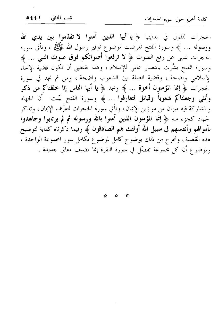 وسورة الفتح بشّرت بانتصار عالمي للإسلام، وهذا يقتضي أن تكون قضية الإخاء الإسلامي واضحة، وقضية الصلة بين الشعوب واضحة، ومن ثم نجد في سورة الحجرات إِنَّمَا الْمُؤْمِنُونَ إِخْوَةٌ ... ونجد يا أَيُّهَا النَّاسُ إِنَّا خَلَقْناكُمْ مِنْ ذَكَرٍ وَأُنْثى وَجَعَلْناكُمْ شُعُوباً وَقَبائِلَ لِتَعارَفُوا ... وسورة الفتح بيّنت أن الجهاد والمشاركة فيه ميزان من موازين الإيمان، وتأتي سورة الحجرات لتعرّف الإيمان، وتذكر الجهاد كجزء منه إِنَّمَا الْمُؤْمِنُونَ الَّذِينَ آمَنُوا بِاللَّهِ وَرَسُولِهِ ثُمَّ لَمْ يَرْتابُوا وَجاهَدُوا بِأَمْوالِهِمْ وَأَنْفُسِهِمْ فِي سَبِيلِ اللَّهِ أُولئِكَ هُمُ الصَّادِقُونَ وفيما ذكرناه كفاية لتوضيح هذه القضية، ونخرج من ذلك بوضوح كامل لموضوع تكامل سور المجموعة الواحدة، ولموضوع أن كل مجموعة تفصّل في سورة البقرة إنما تضيف معاني جديدة.
