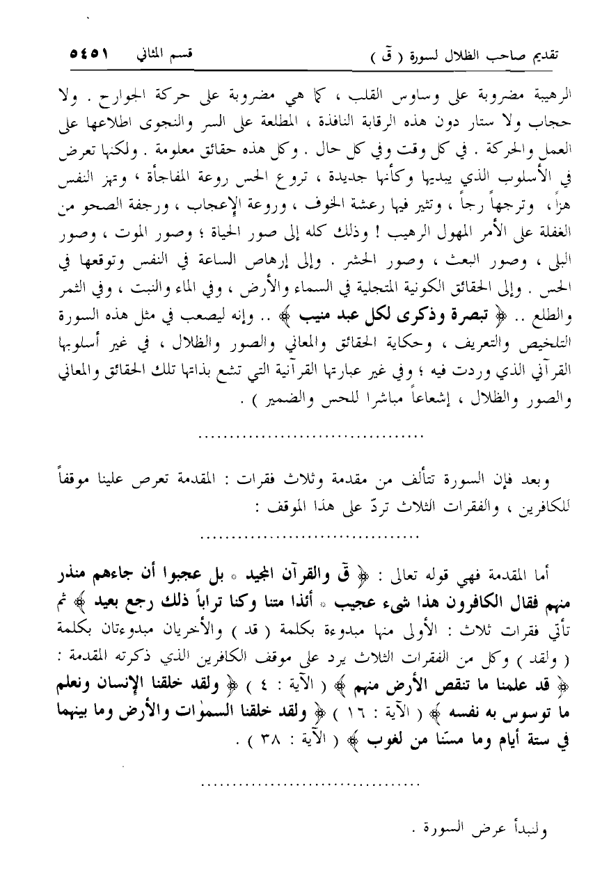 الرهيبة مضروبة على وساوس القلب، كما هي مضروبة على حركة الجوارح. ولا حجاب ولا ستار دون هذه الرقابة النافذة، المطلعة على السر والنجوى اطلاعها على العمل والحركة. في كل وقت وفي كل حال. وكل هذه حقائق معلومة. ولكنها تعرض في الأسلوب الذي يبديها وكأنها جديدة، تروع الحس روعة المفاجأة، وتهز النفس هزا، وترجها رجا، وتثير فيها رعشة الخوف، وروعة الإعجاب، ورجفة الصحو من الغفلة على الأمر المهول الرهيب! وذلك كله إلى صور الحياة؛ وصور الموت، وصور البلى، وصور البعث، وصور الحشر. وإلى إرهاص الساعة في النفس وتوقعها في الحس. وإلى الحقائق الكونية المتجلية في السماء والأرض، وفي الماء والنبت، وفي الثمر والطلع .. تَبْصِرَةً وَذِكْرى لِكُلِّ عَبْدٍ مُنِيبٍ .. وإنه ليصعب في مثل هذه السورة التلخيص والتعريف، وحكاية الحقائق والمعاني والصور والظلال، في غير أسلوبها القرآني الذي وردت فيه؛ وفي غير عبارتها القرآنية التي تشع بذاتها تلك الحقائق والمعاني والصور والظلال، إشعاعا مباشرا للحس والضمير).