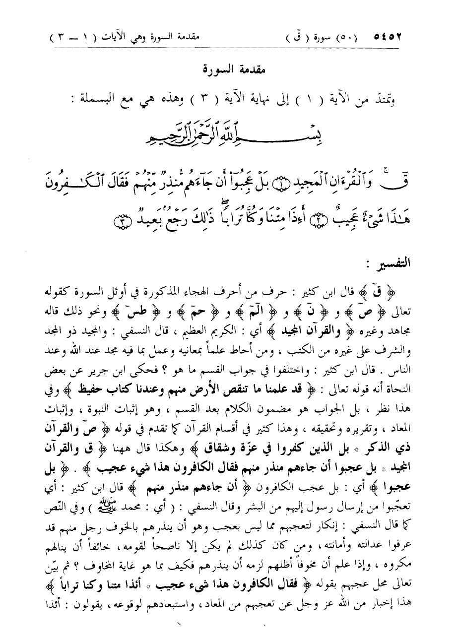 ق قال ابن كثير: حرف من أحرف الهجاء المذكورة في أوائل السورة كقوله تعالى ص ون والم* وحم* وطس ونحو ذلك قاله مجاهد وغيره وَالْقُرْآنِ الْمَجِيدِ أي: الكريم العظيم، قال النسفي: والمجيد ذو المجد والشرف على غيره من الكتب، ومن أحاط علما بمعانيه وعمل بما فيه مجد عند الله وعند الناس. قال ابن كثير: واختلفوا في جواب القسم ما هو؟ فحكى ابن جرير عن بعض النحاة أنه قوله تعالى: قَدْ عَلِمْنا ما تَنْقُصُ الْأَرْضُ مِنْهُمْ وَعِنْدَنا كِتابٌ حَفِيظٌ وفي هذا نظر، بل الجواب هو مضمون الكلام بعد القسم، وهو إثبات النبوة، وإثبات المعاد، وتقريره وتحقيقه، وهذا كثير في أقسام القرآن كما تقدم في قوله ص وَالْقُرْآنِ ذِي الذِّكْرِ* بَلِ الَّذِينَ كَفَرُوا فِي عِزَّةٍ وَشِقاقٍ وهكذا قال هاهنا ق وَالْقُرْآنِ الْمَجِيدِ* بَلْ عَجِبُوا أَنْ جاءَهُمْ مُنْذِرٌ مِنْهُمْ فَقالَ الْكافِرُونَ هذا شَيْءٌ عَجِيبٌ.