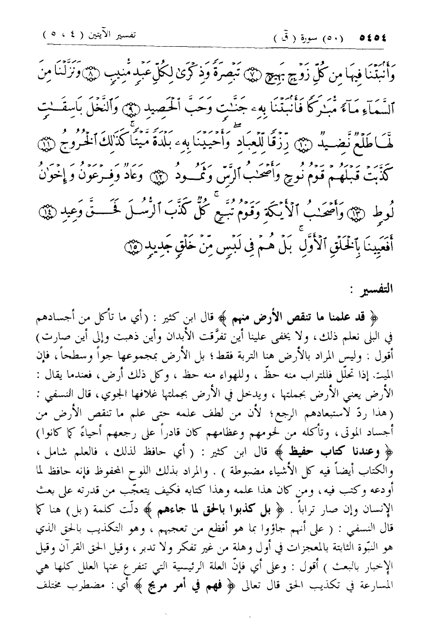 (هذا ردّ لاستبعادهم الرجع؛ لأن من لطف علمه حتى علم ما تنقص الأرض من أجساد الموتى، وتأكله من لحومهم وعظامهم كان قادرا على رجعهم أحياء كما كانوا) وَعِنْدَنا كِتابٌ حَفِيظٌ قال ابن كثير: (أي حافظ لذلك، فالعلم شامل، والكتاب أيضا فيه كل الأشياء مضبوطة). والمراد بذلك اللوح المحفوظ فإنه حافظ لما أودعه وكتب فيه، ومن كان هذا علمه وهذا كتابه فكيف يتعجّب من قدرته على بعث الإنسان وإن صار ترابا.