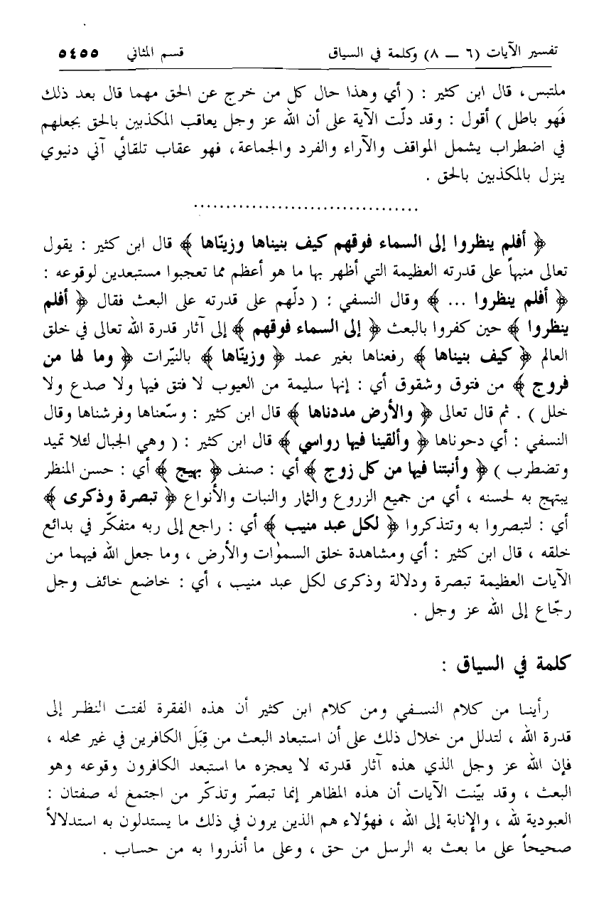 أَفَلَمْ يَنْظُرُوا ... وقال النسفي: (دلّهم على قدرته على البعث فقال أَفَلَمْ يَنْظُرُوا حين كفروا بالبعث إِلَى السَّماءِ فَوْقَهُمْ إلى آثار قدرة الله تعالى في خلق العالم كَيْفَ بَنَيْناها رفعناها بغير عمد وَزَيَّنَّاها بالنيّرات وَما لَها مِنْ فُرُوجٍ من فتوق وشقوق أي: إنها سليمة من العيوب لا فتق فيها ولا صدع ولا خلل).