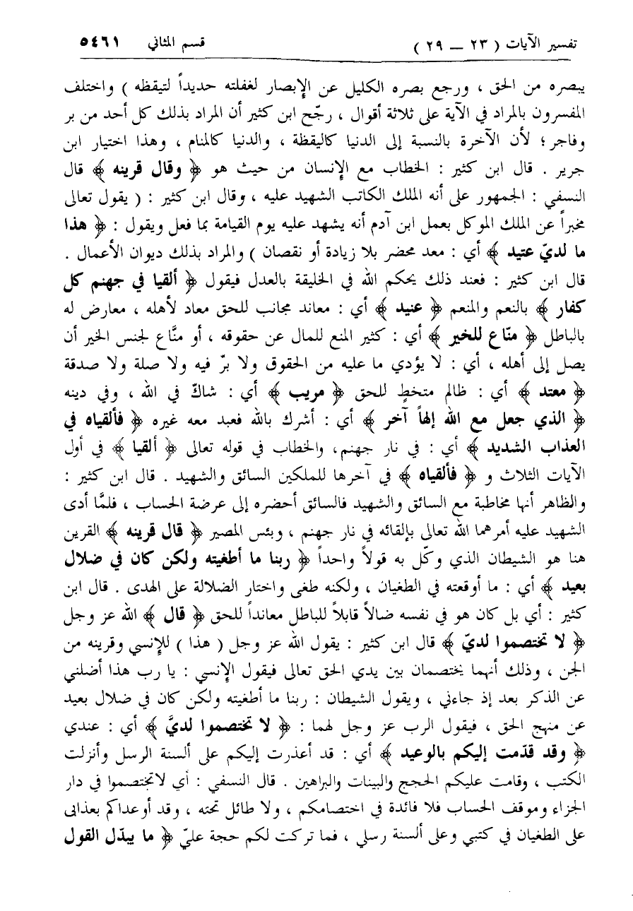قالَ قَرِينُهُ القرين هنا هو الشيطان الذي وكّل به قولا واحدا رَبَّنا ما أَطْغَيْتُهُ وَلكِنْ كانَ فِي ضَلالٍ بَعِيدٍ أي: ما أوقعته في الطغيان، ولكنه طغى واختار الضلالة على الهدى. قال ابن كثير: أي بل كان هو في نفسه ضالا قابلا للباطل معاندا للحق