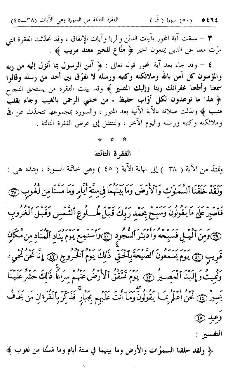 4 - وقد جاء بعد آية المحور قوله تعالى: آمَنَ الرَّسُولُ بِما أُنْزِلَ إِلَيْهِ مِنْ رَبِّهِ وَالْمُؤْمِنُونَ كُلٌّ آمَنَ بِاللَّهِ وَمَلائِكَتِهِ وَكُتُبِهِ وَرُسُلِهِ لا نُفَرِّقُ بَيْنَ أَحَدٍ مِنْ رُسُلِهِ وَقالُوا سَمِعْنا وَأَطَعْنا غُفْرانَكَ رَبَّنا وَإِلَيْكَ الْمَصِيرُ وقد بينت الفقرة من يستحق النجاح هذا ما تُوعَدُونَ لِكُلِّ أَوَّابٍ حَفِيظٍ* مَنْ خَشِيَ الرَّحْمنَ بِالْغَيْبِ وَجاءَ بِقَلْبٍ مُنِيبٍ ولذلك صلاته بالآية الآتية بعد المحور، والسورة بمجموعها تتحدّث عن الله وملائكته وكتبه ورسله واليوم الآخر، ولننتقل إلى عرض الفقرة الثالثة.