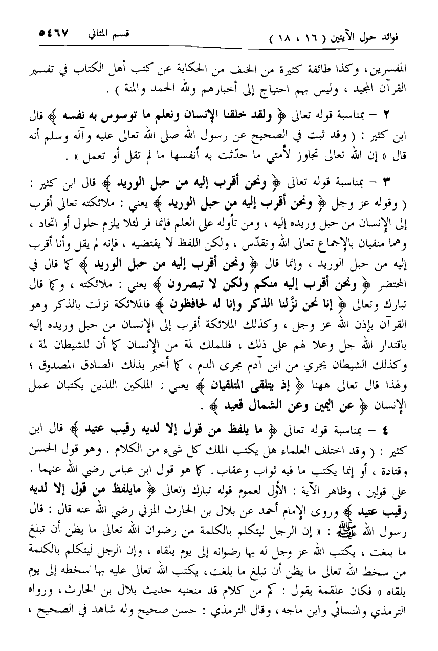 3 - [كلام ابن كثير عن قرب الملائكة من الإنسان بمناسبة آية وَنَحْنُ أَقْرَبُ إِلَيْهِ .. ]