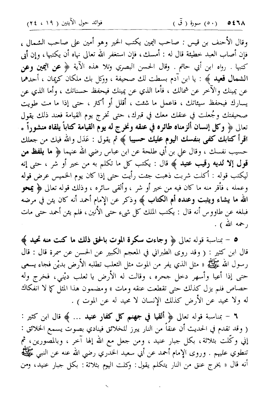 وقال الأحنف بن قيس: صاحب اليمين يكتب الخير وهو أمين على صاحب الشمال، فإن أصاب العبد خطيئة قال له: أمسك، فإن استغفر الله تعالى نهاه أن يكتبها، وإن أبى كتبها. رواه ابن أبي حاتم. وقال الحسن البصري وتلا هذه الآية عَنِ الْيَمِينِ وَعَنِ الشِّمالِ قَعِيدٌ: يا ابن آدم بسطت لك صحيفة، ووكل بك ملكان كريمان، أحدهما عن يمينك والآخر عن شمالك، فأما الذي عن يمينك فيحفظ حسناتك، وأما الذي عن يسارك فيحفظ سيئاتك، فاعمل ما شئت، أقلل أو أكثر، حتى إذا ما مت طويت صحيفتك وجعلت في عنقك معك في قبرك، حتى تخرج يوم القيامة فعند ذلك يقول تعالى وَكُلَّ إِنسانٍ أَلْزَمْناهُ طائِرَهُ فِي عُنُقِهِ وَنُخْرِجُ لَهُ يَوْمَ الْقِيامَةِ كِتاباً يَلْقاهُ مَنْشُوراً* اقْرَأْ كِتابَكَ كَفى بِنَفْسِكَ الْيَوْمَ عَلَيْكَ حَسِيباً ثم يقول: عدل والله فيك من جعلك حسيب نفسك، وقال علي بن أبي طلحة عن ابن عباس رضي الله عنهما ما يَلْفِظُ مِنْ قَوْلٍ إِلَّا لَدَيْهِ رَقِيبٌ عَتِيدٌ قال: يكتب كل ما تكلم به من خير أو شر، حتى إنه ليكتب قوله: أكلت شربت ذهبت جئت رأيت حتى إذا كان يوم الخميس عرض قوله وعمله، فأقر منه ما كان فيه من خير أو شر، وألقى سائره، وذلك قوله تعالى يَمْحُوا اللَّهُ ما يَشاءُ وَيُثْبِتُ وَعِنْدَهُ أُمُّ الْكِتابِ وذكر عن الإمام أحمد أنه كان يئن في مرضه فبلغه عن طاوس أنه قال: يكتب الملك كل شئ حتى الأنين، فلم يئن أحمد حتى مات رحمه الله).