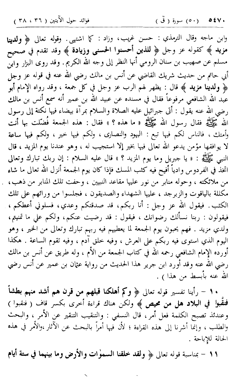وابن ماجه وقال الترمذي: حسن غريب، وزاد: كما اشتهى. وقوله تعالى: وَلَدَيْنا مَزِيدٌ كقوله عزّ وجل لِلَّذِينَ أَحْسَنُوا الْحُسْنى وَزِيادَةٌ وقد تقدم في صحيح مسلم عن صهيب بن سنان الرومي أنها النظر إلى وجه الله الكريم. وقد روى البزار وابن أبي حاتم من حديث شريك القاضي عن أنس بن مالك رضي الله عنه في قوله عزّ وجل وَلَدَيْنا مَزِيدٌ قال: يظهر لهم الرب عزّ وجل في كل جمعة، وقد رواه الإمام أبو عبد الله الشافعي مرفوعا فقال في مسنده عن عبيد الله بن عمير أنه سمع أنس بن مالك رضي الله عنه يقول: أتى جبرائيل عليه الصلاة والسلام بمرآة بيضاء فيها نكتة إلى رسول الله صلّى الله عليه وسلم فقال رسول الله صلّى الله عليه وسلم «ما هذه؟» فقال: هذه الجمعة فضّلت بها أنت وأمتك، فالناس لكم فيها تبع: اليهود والنصارى، ولكم فيها خير، ولكم فيها ساعة لا يوافقها مؤمن يدعو الله تعالى فيها بخير إلا استجيب له، وهو عندنا يوم المزيد، قال النبي صلّى الله عليه وسلم: «يا جبريل وما يوم المزيد؟» قال عليه السلام: إن ربك تبارك وتعالى اتخذ في الفردوس واديا أفيح فيه كثب المسك فإذا كان يوم الجمعة أنزل الله تعالى ما شاء من ملائكته، وحوله منابر من نور عليها مقاعد النبيين، وحفت تلك المنابر من ذهب، مكللة بالياقوت والزبرجد، عليها الشهداء والصديقون، فجلسوا من ورائهم على تلك الكثب. فيقول الله عزّ وجل: أنا ربكم، قد صدقتكم وعدي، فسلوني أعطكم، فيقولون: ربنا نسألك رضوانك، فيقول: قد رضيت عنكم، ولكم علي ما تمنيتم، ولدي مزيد. فهم يحبون يوم الجمعة لما يعطيهم فيه ربهم تبارك وتعالى من الخير، وهو اليوم الذي استوى فيه ربكم على العرش، وفيه خلق آدم، وفيه تقوم الساعة. هكذا أورده الإمام الشافعي رحمه الله في كتاب الجمعة من الأم، وله طريق عن أنس بن مالك رضي الله عنه وقد أورد ابن جرير هذا الحديث من رواية عثمان بن عمير عن أنس رضي الله عنه بأبسط من هذا).