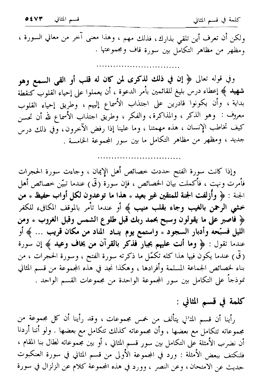 وإذا كانت سورة الفتح حددت خصائص أهل الإيمان، وجاءت سورة الحجرات فأمرت ونهت، فأكملت بيان الخصائص، فإن سورة (ق) عند ما تبيّن خصائص أهل الجنة: وَأُزْلِفَتِ الْجَنَّةُ لِلْمُتَّقِينَ غَيْرَ بَعِيدٍ* هذا ما تُوعَدُونَ لِكُلِّ أَوَّابٍ حَفِيظٍ* مَنْ خَشِيَ الرَّحْمنَ بِالْغَيْبِ وَجاءَ بِقَلْبٍ مُنِيبٍ أو عند ما تأمر بالموقف المكافئ للكفر فَاصْبِرْ عَلى ما يَقُولُونَ وَسَبِّحْ بِحَمْدِ رَبِّكَ قَبْلَ طُلُوعِ الشَّمْسِ وَقَبْلَ الْغُرُوبِ* وَمِنَ اللَّيْلِ فَسَبِّحْهُ وَأَدْبارَ السُّجُودِ* وَاسْتَمِعْ يَوْمَ يُنادِ الْمُنادِ مِنْ مَكانٍ قَرِيبٍ ... أو عند ما تقول: وَما أَنْتَ عَلَيْهِمْ بِجَبَّارٍ فَذَكِّرْ بِالْقُرْآنِ مَنْ يَخافُ وَعِيدِ إن سورة (ق) عند ما يكون فيها هذا كله تكمّل ما ذكرته سورة الفتح، وسورة الحجرات، من بناء لخصائص الجماعة المسلمة وأفرادها، وهكذا نجد في هذه المجموعة من قسم المثاني نموذجا على التكامل بين سور المجموعة الواحدة من مجموعات القسم الواحد.