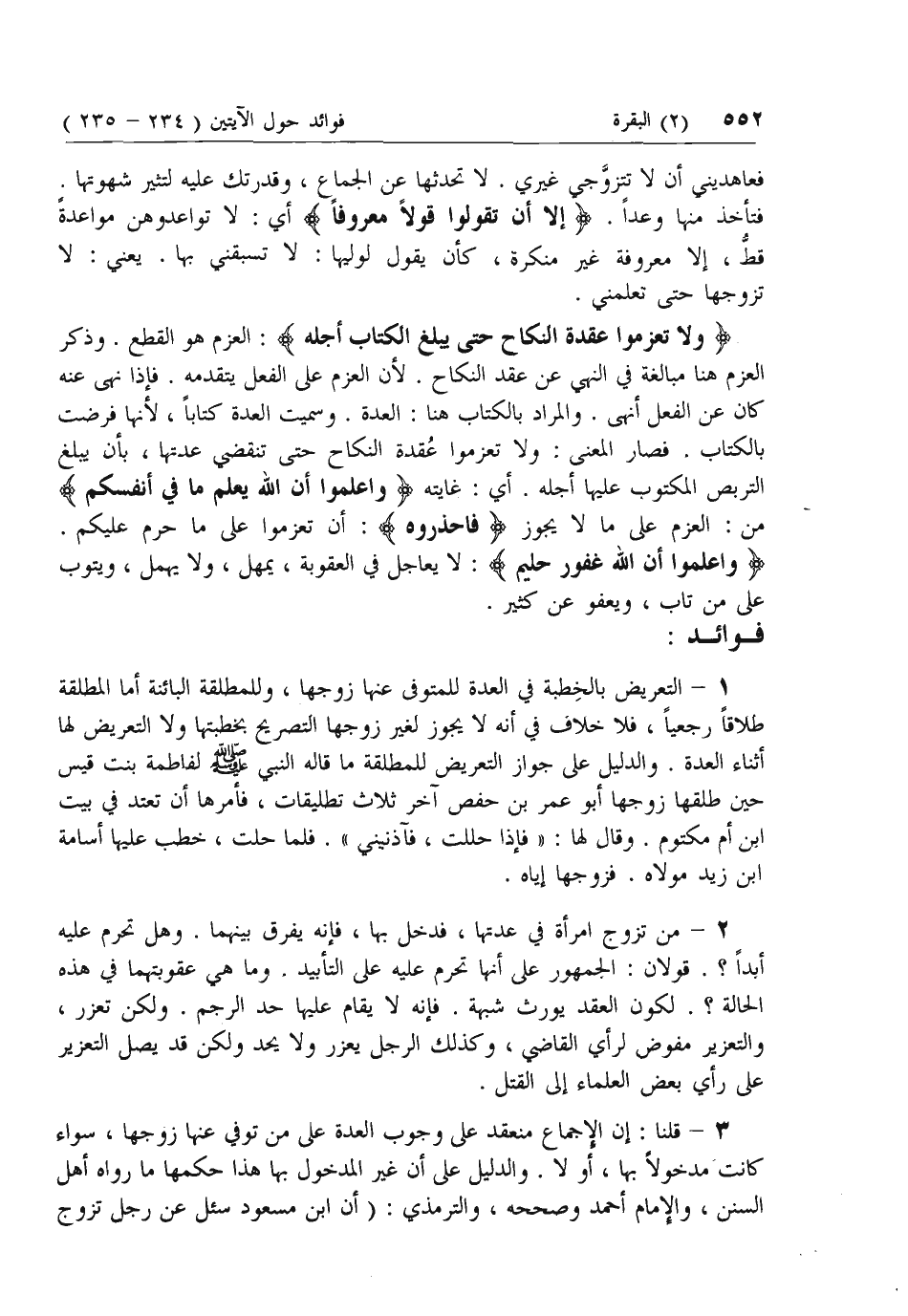 وَلا تَعْزِمُوا عُقْدَةَ النِّكاحِ حَتَّى يَبْلُغَ الْكِتابُ أَجَلَهُ: العزم هو القطع. وذكر العزم هنا مبالغة في النهي عن عقد النكاح. لأن العزم على الفعل يتقدمه. فإذا نهى عنه كان عن الفعل أنهى. والمراد بالكتاب هنا: العدة. وسميت العدة كتابا، لأنها فرضت بالكتاب. فصار المعنى: ولا تعزموا عقدة النكاح حتى تنقضي عدتها، بأن يبلغ التربص المكتوب عليها أجله. أي: غايته وَاعْلَمُوا أَنَّ اللَّهَ يَعْلَمُ ما فِي أَنْفُسِكُمْ من: العزم على ما لا يجوز فَاحْذَرُوهُ: أن تعزموا على ما حرم عليكم.