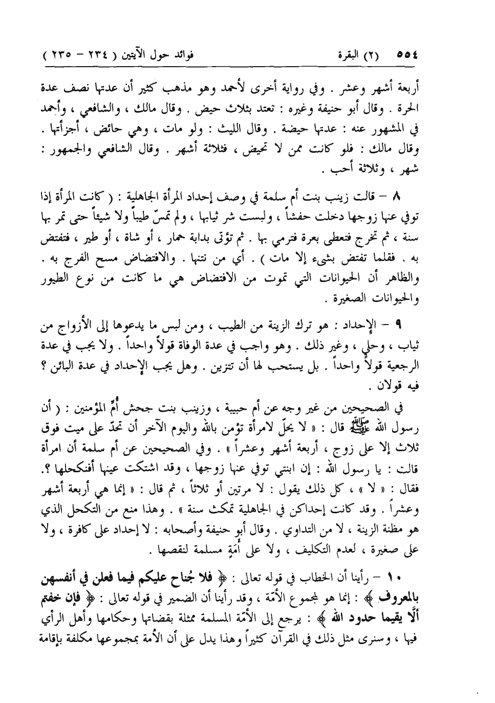 10 - رأينا أن الخطاب في قوله تعالى: فَلا جُناحَ عَلَيْكُمْ فِيما فَعَلْنَ فِي أَنْفُسِهِنَّ بِالْمَعْرُوفِ: إنما هو لمجموع الأمة، وقد رأينا أن الضمير في قوله تعالى: فَإِنْ خِفْتُمْ أَلَّا يُقِيما حُدُودَ اللَّهِ: يرجع إلى الأمة المسلمة ممثلة بقضاتها وحكامها وأهل الرأي فيها، وسنرى مثل ذلك في القرآن كثيرا وهذا يدل على أن الأمة بمجموعها مكلفة بإقامة
