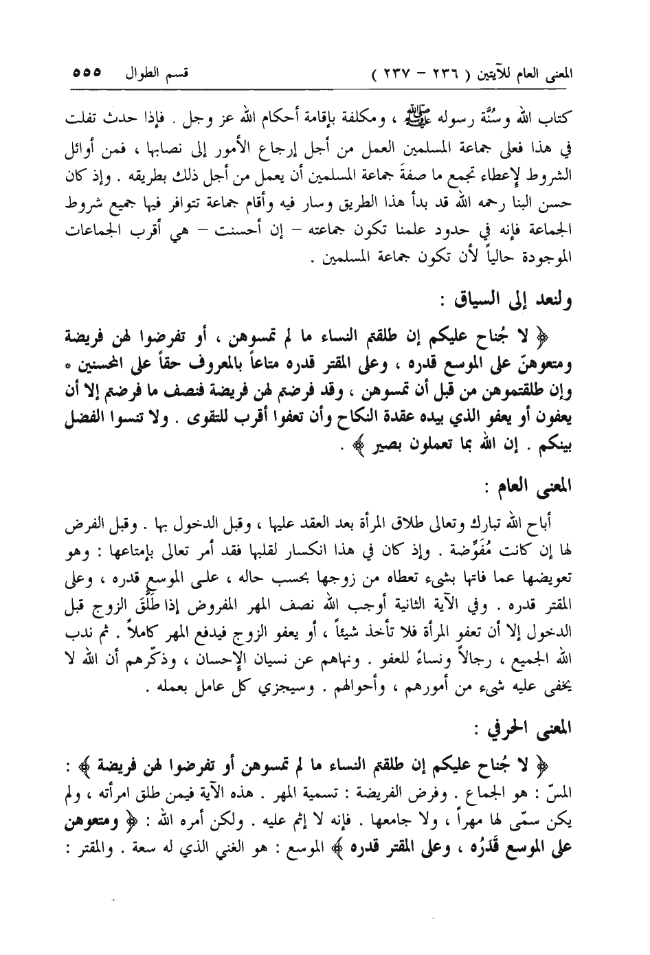 المس: هو الجماع. وفرض الفريضة: تسمية المهر. هذه الآية فيمن طلق امرأته، ولم يكن سمى لها مهرا، ولا جامعها. فإنه لا إثم عليه. ولكن أمره الله: وَمَتِّعُوهُنَّ عَلَى الْمُوسِعِ قَدَرُهُ، وَعَلَى الْمُقْتِرِ قَدَرُهُ الموسع: هو الغني الذي له سعة. والمقتر: