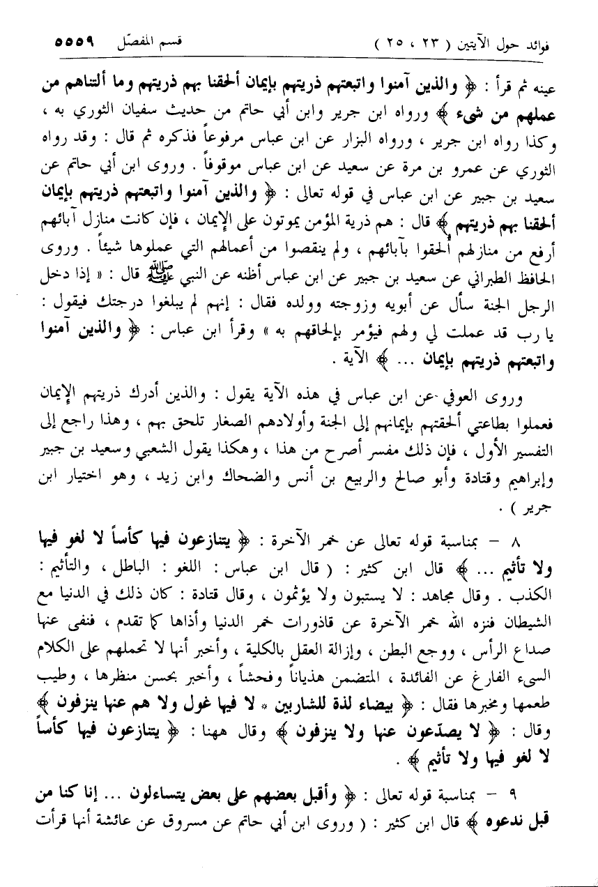 وروى العوفي عن ابن عباس في هذه الآية يقول: والذين أدرك ذريتهم الإيمان فعملوا بطاعتي ألحقتهم بإيمانهم إلى الجنة وأولادهم الصغار تلحق بهم، وهذا راجع إلى التفسير الأول، فإن ذلك مفسر أصرح من هذا، وهكذا يقول الشعبي وسعيد بن جبير وإبراهيم وقتادة وأبو صالح والربيع بن أنس والضحاك وابن زيد، وهو اختيار ابن جرير).