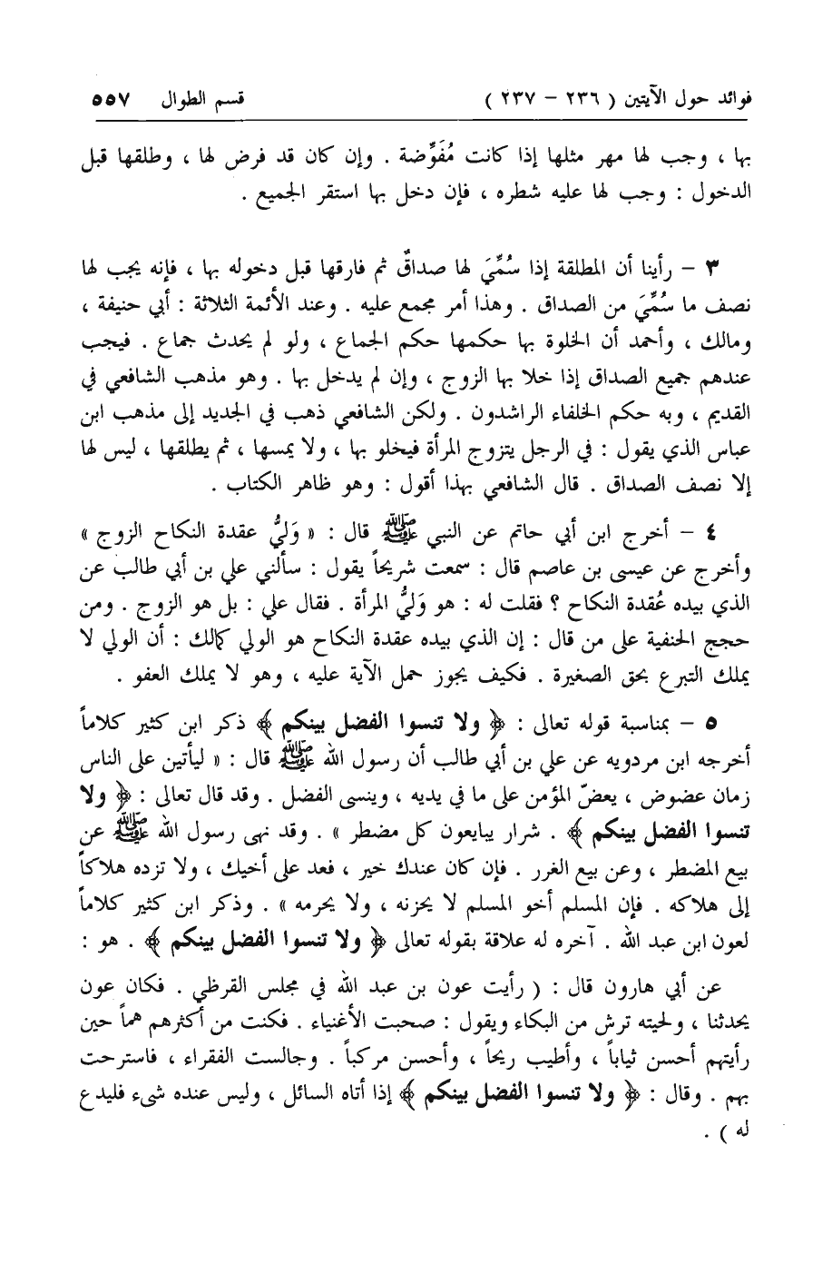 5 - بمناسبة قوله تعالى: وَلا تَنْسَوُا الْفَضْلَ بَيْنَكُمْ ذكر ابن كثير كلاما أخرجه ابن مردويه عن علي بن أبي طالب أن رسول الله صلى الله عليه وسلم قال: «ليأتين على الناس زمان عضوض، يعض المؤمن على ما في يديه، وينسى الفضل. وقد قال تعالى: وَلا تَنْسَوُا الْفَضْلَ بَيْنَكُمْ. شرار يبايعون كل مضطر». وقد نهى رسول الله صلى الله عليه وسلم عن بيع المضطر، وعن بيع الغرر. فإن كان عندك خير، فعد على أخيك، ولا تزده هلاكا إلى هلاكه. فإن المسلم أخو المسلم لا يحزنه، ولا يحرمه». وذكر ابن كثير كلاما لعون ابن عبد الله. آخره له علاقة بقوله تعالى وَلا تَنْسَوُا الْفَضْلَ بَيْنَكُمْ. هو: