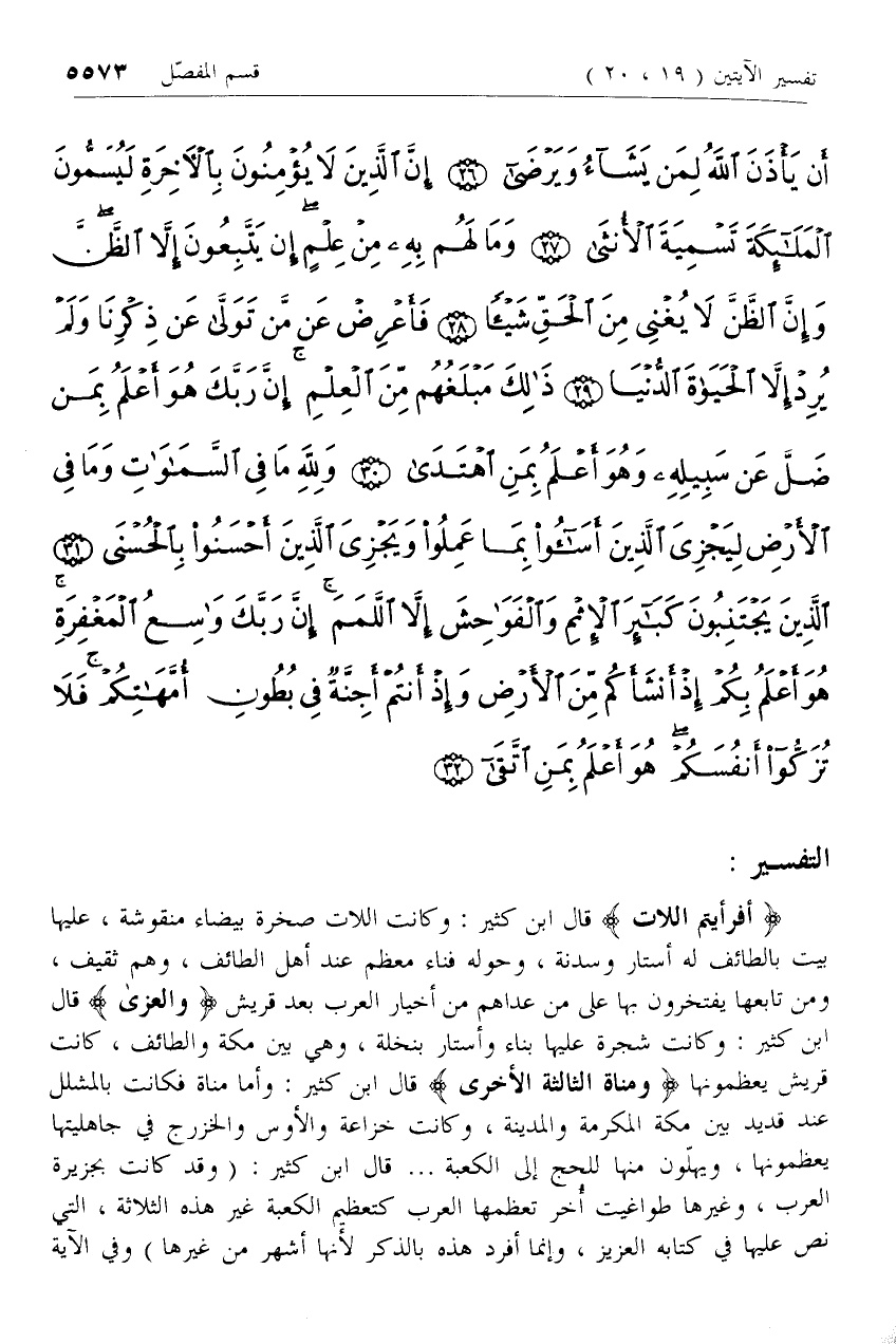 أَفَرَأَيْتُمُ اللَّاتَ قال ابن كثير: وكانت اللات صخرة بيضاء منقوشة، عليها بيت بالطائف له أستار وسدنة، وحوله فناء معظم عند أهل الطائف، وهم ثقيف، ومن تابعها يفتخرون بها على من عداهم من أخيار العرب بعد قريش وَالْعُزَّى قال ابن كثير: وكانت شجرة عليها بناء وأستار بنخلة، وهي بين مكة والطائف، كانت قريش يعظمونها