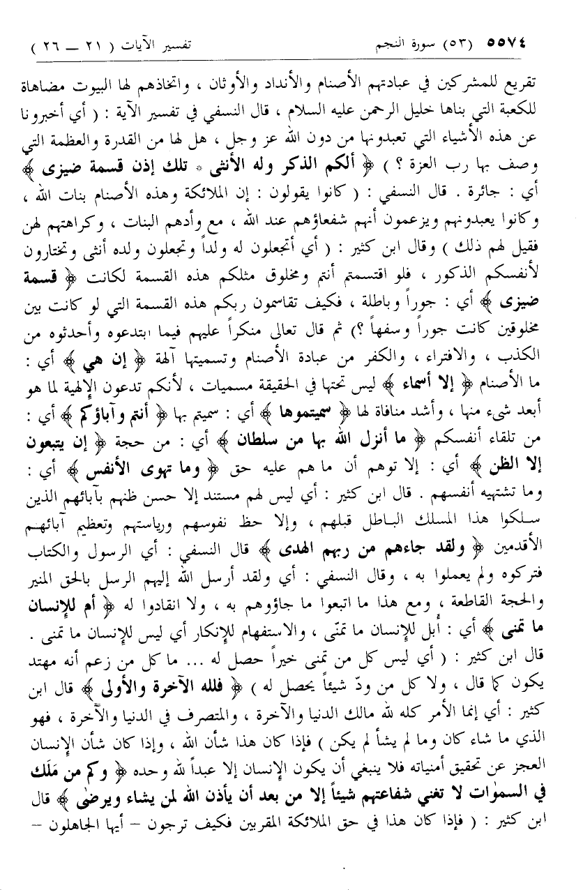 أَلَكُمُ الذَّكَرُ وَلَهُ الْأُنْثى * تِلْكَ إِذاً قِسْمَةٌ ضِيزى أي: جائرة. قال النسفي: (كانوا يقولون: إن الملائكة وهذه الأصنام بنات الله، وكانوا يعبدونهم ويزعمون أنهم شفعاؤهم عند الله، مع وأدهم البنات، وكراهتهم لهن فقيل لهم ذلك) وقال ابن كثير: (أي أتجعلون له ولدا وتجعلون ولده أنثى وتختارون لأنفسكم الذكور،