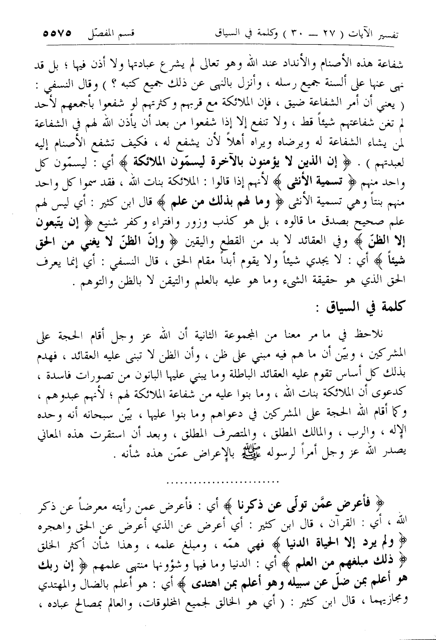 نلاحظ في ما مر معنا من المجموعة الثانية أن الله عزّ وجل أقام الحجة على المشركين، وبين أن ما هم فيه مبني على ظن، وأن الظن لا تبنى عليه العقائد، فهدم بذلك كل أساس تقوم عليه العقائد الباطلة وما يبني عليها البانون من تصورات فاسدة، كدعوى أن الملائكة بنات الله، وما بنوا عليه من شفاعة الملائكة لهم؛ لأنهم عبدوهم، وكما أقام الله الحجة على المشركين في دعواهم وما بنوا عليها، بين سبحانه أنه وحده الإله، والرب، والمالك المطلق، والمتصرف المطلق، وبعد أن استقرت هذه المعاني يصدر الله عزّ وجل أمرا لرسوله صلى الله عليه وسلم بالإعراض عمن هذه شأنه.