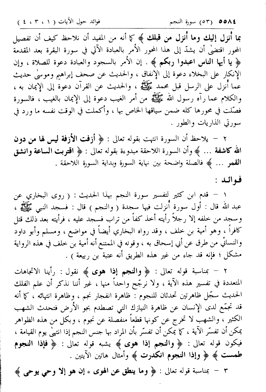 1 - قدم ابن كثير لتفسير سورة النجم بهذا الحديث: (روى البخاري عن عبد الله قال: أول سورة أنزلت فيها سجدة (والنجم) قال: فسجد النبي صلى الله عليه وسلم، وسجد من خلفه إلا رجلا رأيته أخذ كفا من تراب فسجد عليه، فرأيته بعد ذلك قتل كافرا، وهو أمية بن خلف، وقد رواه البخاري أيضا في مواضع، ومسلم وأبو داود والنسائي من طرق عن أبي إسحاق به، وقوله في الممتنع أنه أمية بن خلف في هذه الرواية مشكل؛ فإنه قد جاء من غير هذه الطريق أنه عتبة بن ربيعة).