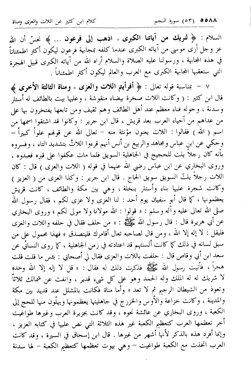 7 - بمناسبة قوله تعالى: أَفَرَأَيْتُمُ اللَّاتَ وَالْعُزَّى* وَمَناةَ الثَّالِثَةَ الْأُخْرى قال ابن كثير: (وكانت اللات صخرة بيضاء منقوشة، وعليها بيت بالطائف له أستار وسدنة، وحوله فناء معظم عند أهل الطائف وهم ثقيف ومن تابعها يفتخرون بها على من عداهم من أحياء العرب بعد قريش، قال ابن جرير: وكانوا قد اشتقوا اسمها من اسم (الله) فقالوا: اللات يعنون مؤنثة منه- تعالى الله عن قولهم علوا كبيرا- وحكي عن ابن عباس ومجاهد والربيع بن أنس أنهم قرءوا اللات بتشديد التاء، وفسروه بأنه كان رجلا يلت للحجيج في الجاهلية السويق فلما مات عكفوا على قبره فعبدوه، وروى البخاري عن ابن عباس رضي الله عنهما في قوله (اللات والعزى) قال: كان اللات رجلا يلت السويق سويق الحاج. قال ابن جرير: وكذا العزى من (العزيز) وكانت شجرة عليها بناء وأستار بنخلة، وهي بين مكة والطائف، كانت قريش يعظمونها، كما قال أبو سفيان يوم أحد: لنا العزى ولا عزى لكم، فقال رسول الله صلى الله تعالى عليه وآله وسلم: «قولوا: الله مولانا ولا مولى لكم» وروى البخاري عن أبي هريرة قال: قال رسول الله صلى الله عليه وسلم: «من حلف فقال في حلفه واللات والعزى فليقل: لا إله إلا الله، ومن قال لصاحبه تعال أقامرك فليتصدق» فهذا محمول على من سبق لسانه في ذلك كما كانت ألسنتهم قد اعتادته في زمن الجاهلية، كما روى النسائي عن سعد ابن أبي وقاص قال: حلفت باللات والعزى فقال لي أصحابي: بئس ما قلت قلت هجرا، فأتيت رسول الله صلى الله عليه وسلم فذكرت ذلك له فقال: «قل لا إله إلا الله وحده لا شريك له له الملك وله الحمد وهو على كل شئ قدير، وانفث عن شمالك ثلاثا وتعوذ من الشيطان الرجيم ثم لا تعد» وأما مناة فكانت بالمشلل عند قديد بين مكة والمدينة، وكانت خزاعة والأوس والخزرج في جاهليتها يعظمونها ويهلون منها للحج إلى الكعبة، وروى البخاري عن عائشة نحوه، وقد كانت بجزيرة العرب وغيرها طواغيت أخر تعظمها العرب كتعظيم الكعبة غير هذه الثلاثة التي نص عليها في كتابه العزيز، وإنما أفرد هذه بالذكر لأنها أشهر من غيرها. قال ابن إسحاق في السيرة، وقد كانت العرب اتخذت مع الكعبة طواغيت- وهي بيوت تعظمها كتعظيم الكعبة- لها سدنة