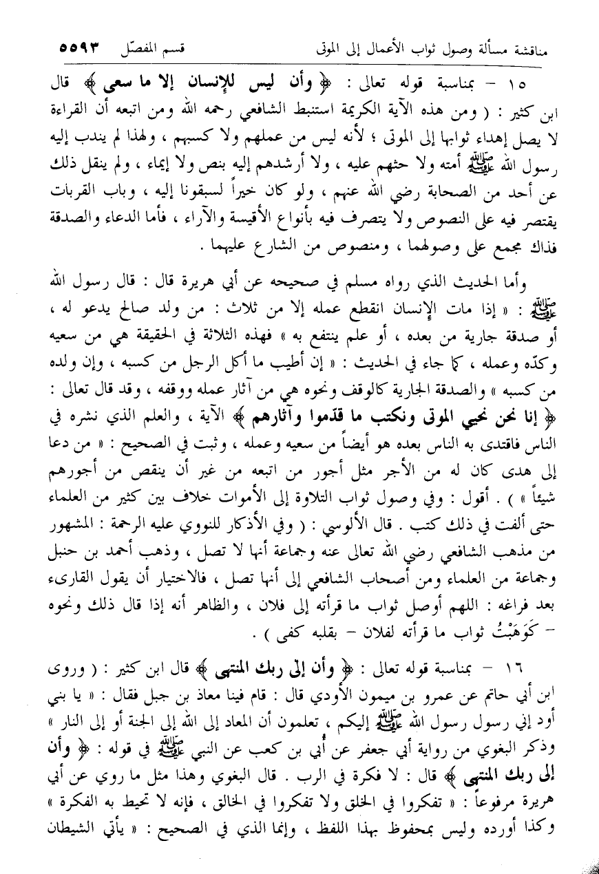 إِنَّا نَحْنُ نُحْيِ الْمَوْتى وَنَكْتُبُ ما قَدَّمُوا وَآثارَهُمْ الآية، والعلم الذي نشره في الناس فاقتدى به الناس بعده هو أيضا من سعيه وعمله، وثبت في الصحيح: «من دعا إلى هدى كان له من الأجر مثل أجور من اتبعه من غير أن ينقص من أجورهم شيئا»). أقول: وفي وصول ثواب التلاوة إلى الأموات خلاف بين كثير من العلماء حتى ألفت في ذلك كتب. قال الألوسي: (وفي الأذكار للنووي عليه الرحمة: المشهور من مذهب الشافعي رضي الله تعالى عنه وجماعة أنها لا تصل، وذهب أحمد بن حنبل وجماعة من العلماء ومن أصحاب الشافعي إلى أنها تصل، فالاختيار أن يقول القارئ بعد فراغه: اللهم أوصل ثواب ما قرأته إلى فلان، والظاهر أنه إذا قال ذلك ونحوه- كوهبت ثواب ما قرأته لفلان- بقلبه كفى).