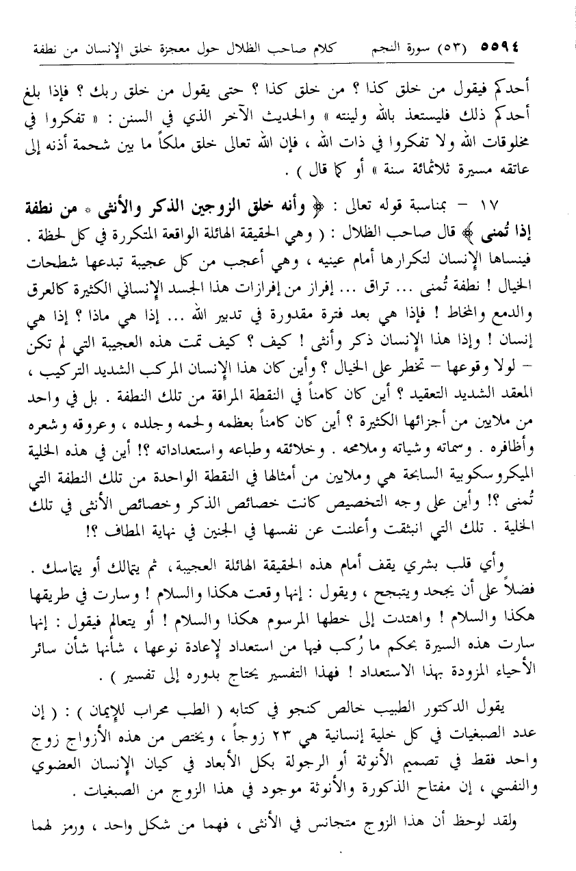 17 - بمناسبة قوله تعالى: وَأَنَّهُ خَلَقَ الزَّوْجَيْنِ الذَّكَرَ وَالْأُنْثى * مِنْ نُطْفَةٍ إِذا تُمْنى قال صاحب الظلال: (وهي الحقيقة الهائلة الواقعة المتكررة في كل لحظة.