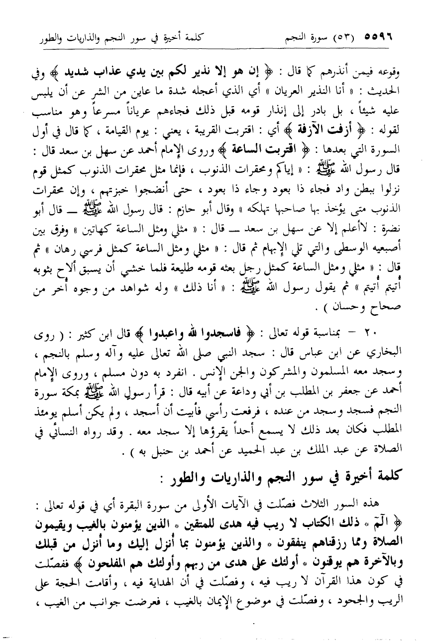20 - بمناسبة قوله تعالى: فَاسْجُدُوا لِلَّهِ وَاعْبُدُوا قال ابن كثير: (روى البخاري عن ابن عباس قال: سجد النبي صلى الله تعالى عليه وآله وسلم بالنجم، وسجد معه المسلمون والمشركون والجن والإنس. انفرد به دون مسلم، وروى الإمام أحمد عن جعفر بن المطلب بن أبي وداعة عن أبيه قال: قرأ رسول الله صلى الله عليه وسلم بمكة سورة النجم فسجد وسجد من عنده، فرفعت رأسي فأبيت أن أسجد، ولم يكن أسلم يومئذ المطلب فكان بعد ذلك لا يسمع أحدا يقرؤها إلا سجد معه. وقد رواه النسائي في الصلاة عن عبد الملك بن عبد الحميد عن أحمد بن حنبل به).