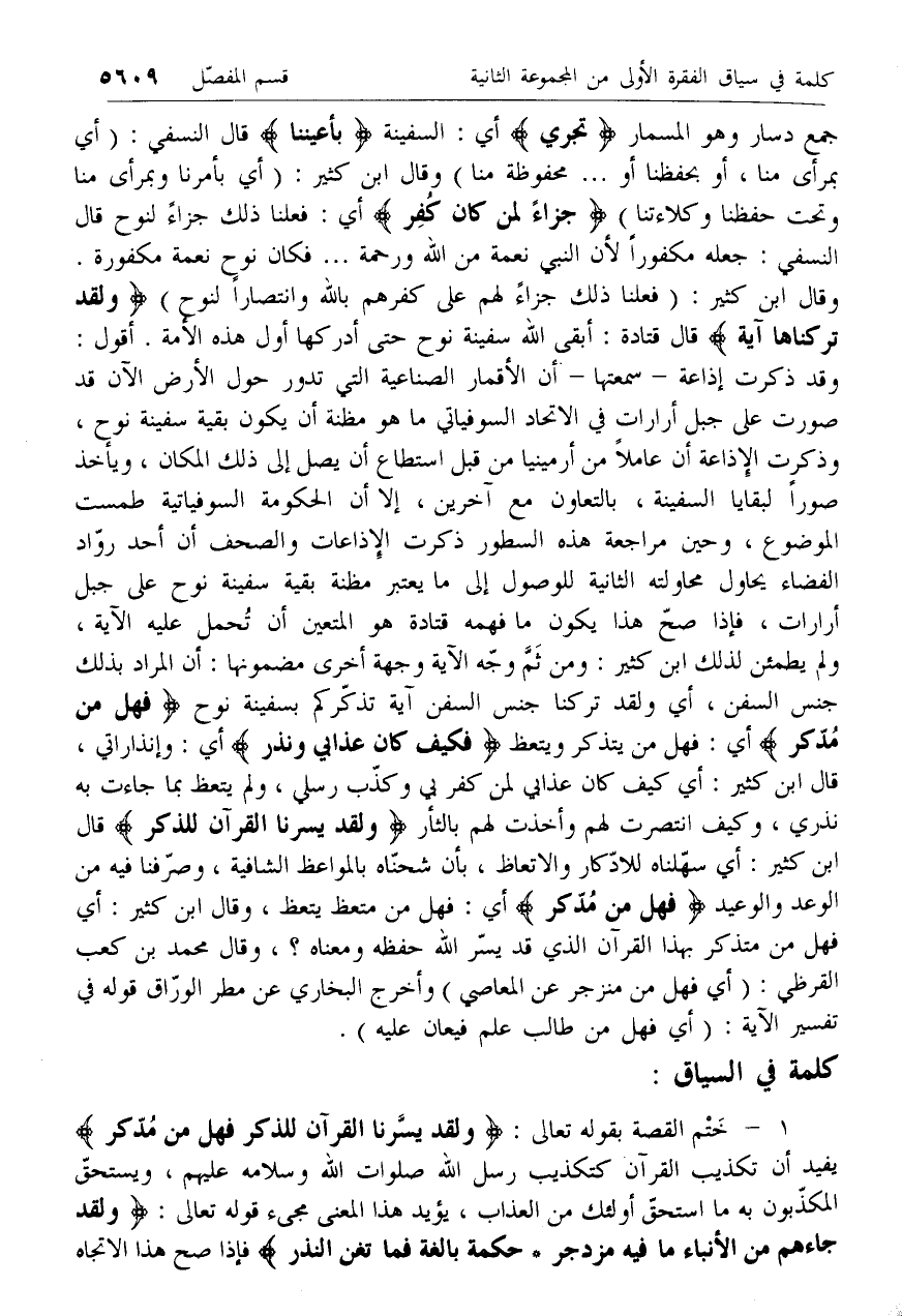 وقد ذكرت إذاعة- سمعتها- أن الأقمار الصناعية التي تدور حول الأرض الآن قد صورت على جبل أرارات في الاتحاد السوفياتي ما هو مظنة أن يكون بقية سفينة نوح، وذكرت الإذاعة أن عاملا من أرمينيا من قبل استطاع أن يصل إلى ذلك المكان، ويأخذ صورا لبقايا السفينة، بالتعاون مع آخرين، إلا أن الحكومة السوفياتية طمست الموضوع، وحين مراجعة هذه السطور ذكرت الإذاعات والصحف أن أحد رواد الفضاء يحاول محاولته الثانية للوصول إلى ما يعتبر مظنة بقية سفينة نوح على جبل أرارات، فإذا صح هذا يكون ما فهمه قتادة هو المتعين أن تحمل عليه الآية، ولم يطمئن لذلك ابن كثير: ومن ثم وجه الآية وجهة أخرى مضمونها: أن المراد بذلك جنس السفن، أي ولقد تركنا جنس السفن آية تذكركم بسفينة نوح فَهَلْ مِنْ مُدَّكِرٍ أي: فهل من يتذكر ويتعظ