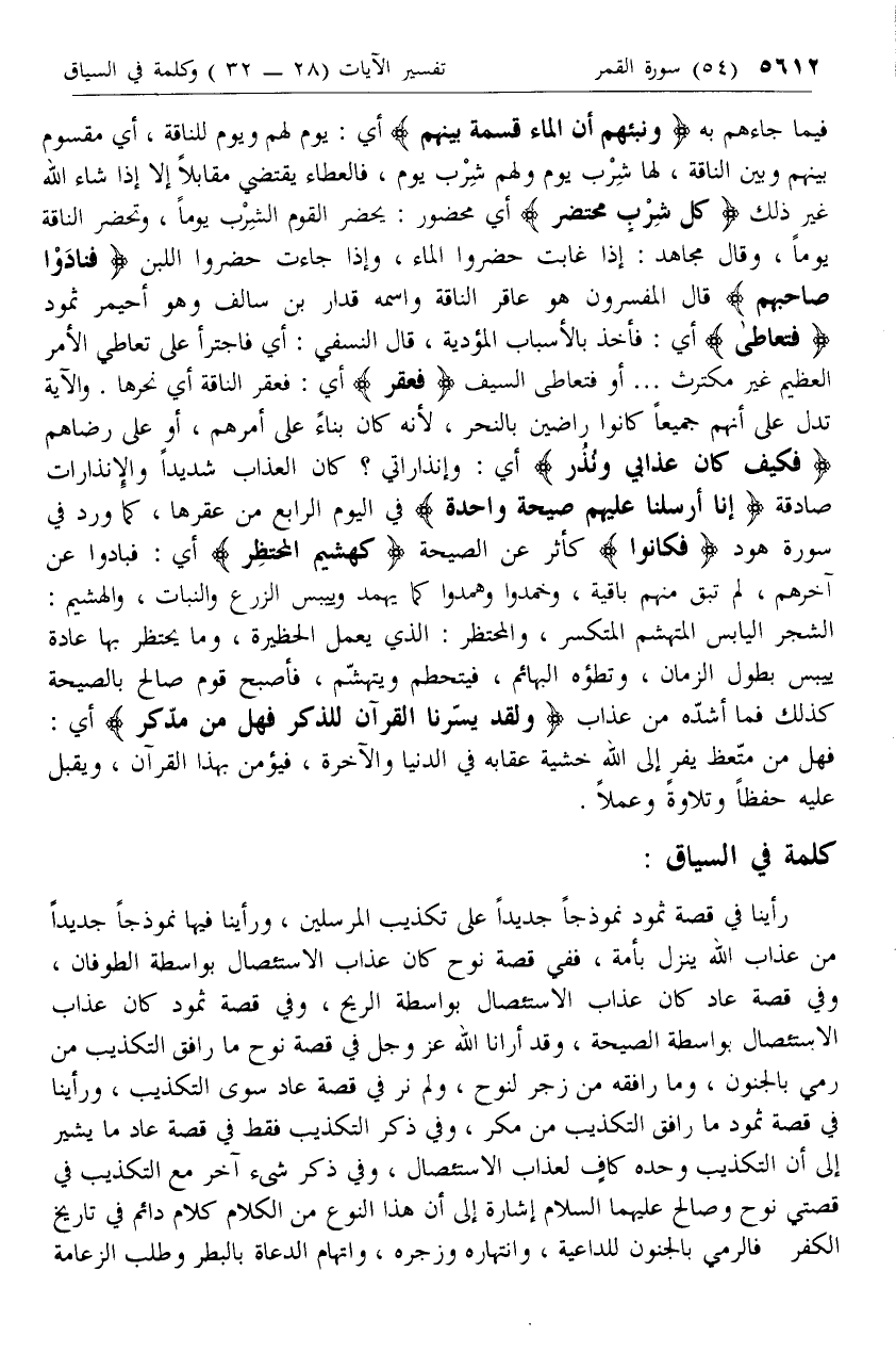 فَنادَوْا صاحِبَهُمْ قال المفسرون هو عاقر الناقة واسمه قدار بن سالف وهو أحيمر ثمود فَتَعاطى أي: فأخذ بالأسباب المؤدية، قال النسفي: أي فاجترأ على تعاطي الأمر العظيم غير مكترث ... أو فتعاطى السيف فَعَقَرَ أي: فعقر الناقة أي نحرها. والآية تدل على أنهم جميعا كانوا راضين بالنحر، لأنه كان بناء على أمرهم، أو على رضاهم