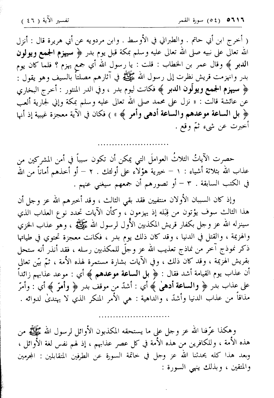 سَيُهْزَمُ الْجَمْعُ وَيُوَلُّونَ الدُّبُرَ فكانت ليوم بدر، وفي الدر المنثور: أخرج البخاري عن عائشة قالت: «نزل على محمد صلى الله تعالى عليه وسلم بمكة وإني لجارية ألعب بَلِ السَّاعَةُ مَوْعِدُهُمْ وَالسَّاعَةُ أَدْهى وَأَمَرُّ») فكان في الآية معجزة غيبية إذ أنها أخبرت عن شئ ثم وقع.