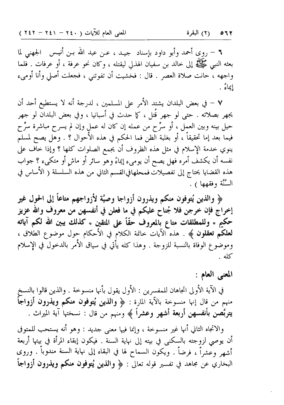 وَالَّذِينَ يُتَوَفَّوْنَ مِنْكُمْ وَيَذَرُونَ أَزْواجاً وَصِيَّةً لِأَزْواجِهِمْ مَتاعاً إِلَى الْحَوْلِ غَيْرَ إِخْراجٍ فَإِنْ خَرَجْنَ فَلا جُناحَ عَلَيْكُمْ فِي ما فَعَلْنَ فِي أَنْفُسِهِنَّ مِنْ مَعْرُوفٍ وَاللَّهُ عَزِيزٌ حَكِيمٌ* وَلِلْمُطَلَّقاتِ مَتاعٌ بِالْمَعْرُوفِ حَقًّا عَلَى الْمُتَّقِينَ* كَذلِكَ يُبَيِّنُ اللَّهُ لَكُمْ آياتِهِ لَعَلَّكُمْ تَعْقِلُونَ. هذه الآيات خاتمة الكلام في الأحكام حول موضوع الطلاق، وموضوع الوفاة بالنسبة للزوجة. وهذا كله يأتي في سياق الأمر بالدخول في الإسلام كله.