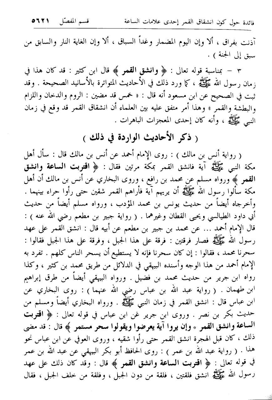 3 - بمناسبة قوله تعالى: وَانْشَقَّ الْقَمَرُ قال ابن كثير: قد كان هذا في زمان رسول الله صلى الله عليه وسلم، كما ورد ذلك في الأحاديث المتواترة بالأسانيد الصحيحة. وقد ثبت في الصحيح عن ابن مسعود أنه قال: «خمس قد مضين: الروم والدخان واللزام والبطشة والقمر» وهذا أمر متفق عليه بين العلماء أن انشقاق القمر قد وقع في زمان النبي صلى الله عليه وسلم، وأنه كان إحدى المعجزات الباهرات.