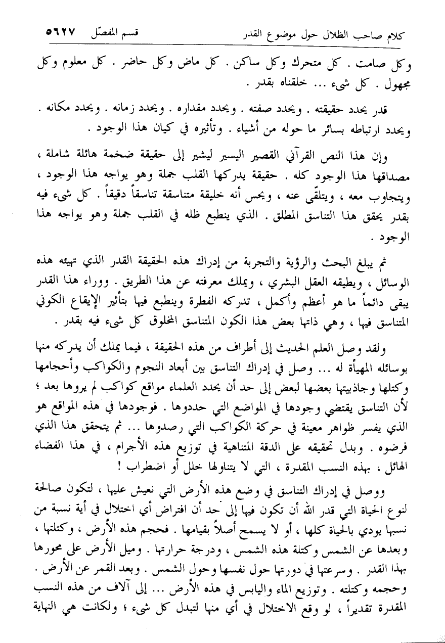 ولقد وصل العلم الحديث إلى أطراف من هذه الحقيقة، فيما يملك أن يدركه منها بوسائله المهيأة له ... وصل في إدراك التناسق بين أبعاد النجوم والكواكب وأحجامها وكتلها وجاذبيتها بعضها لبعض إلى حد أن يحدد العلماء مواقع كواكب لم يروها بعد؛ لأن التناسق يقتضي وجودها في المواضع التي حددوها. فوجودها في هذه المواقع هو الذي يفسر ظواهر معينة في حركة الكواكب التي رصدوها ... ثم يتحقق هذا الذي فرضوه. وبدل تحقيقه على الدقة المتناهية في توزيع هذه الأجرام، في هذا الفضاء الهائل، بهذه النسب المقدرة، التي لا يتناولها خلل أو اضطراب!