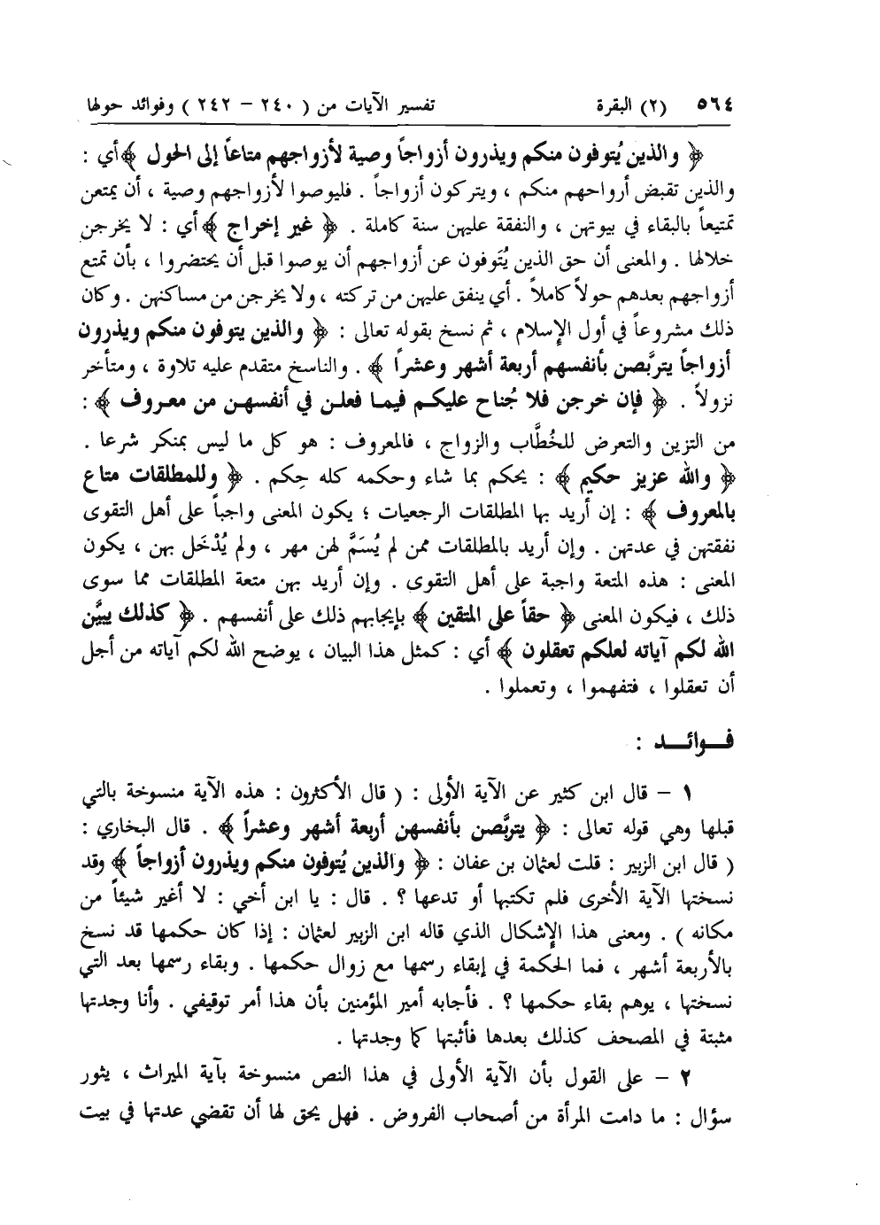1 - قال ابن كثير عن الآية الأولى: (قال الأكثرون: هذه الآية منسوخة بالتي قبلها وهي قوله تعالى: يَتَرَبَّصْنَ بِأَنْفُسِهِنَّ أَرْبَعَةَ أَشْهُرٍ وَعَشْراً. قال البخاري: