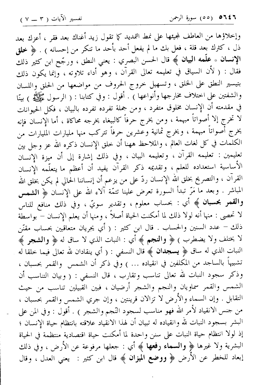 خَلَقَ الْإِنْسانَ* عَلَّمَهُ الْبَيانَ قال الحسن البصري: يعني النطق، ورجح ابن كثير ذلك فقال: (لأن السياق في تعليمه تعالى القرآن، وهو أداء تلاوته، وإنما يكون ذلك بتيسير النطق على الخلق، وتسهيل خروج الحروف من مواضعها من الحلق واللسان والشفتين على اختلاف مخارجها وأنواعها). أقول: وفي كتابنا: (الرسول صلى الله عليه وسلم) بينا في مقدمته أن الإنسان مخلوق متفرد، ومن جملة تفرده تفرده بالبيان، فكل الحيوانات لا تخرج إلا أصواتا مبهمة، ومن يخرج حرفا كالببغاء يخرجه محاكاة، أما الإنسان فإنه يخرج أصواتا مبهمة، ويخرج ثمانية وعشرين حرفا تتركب منها مليارات المليارات من الكلمات في كل لغات العالم، والملاحظ هاهنا أن خلق الإنسان ذكره الله عزّ وجل بين تعليمين: تعليمه القرآن، وتعليمه البيان، وفي ذلك إشارة إلى أن ميزة الإنسان الأساسية استعداده للعلم، وتقديمه ذكر القرآن يفيد أن أعظم ما يتعلمه الإنسان القرآن، والتصريح بخلق الله الإنسان رد على من يزعم أن إنساننا الحالي لم يكن بخلق الله المباشر. وبعد ما مر تبدأ السورة تعرض علينا تتمة آلاء الله على الإنسان