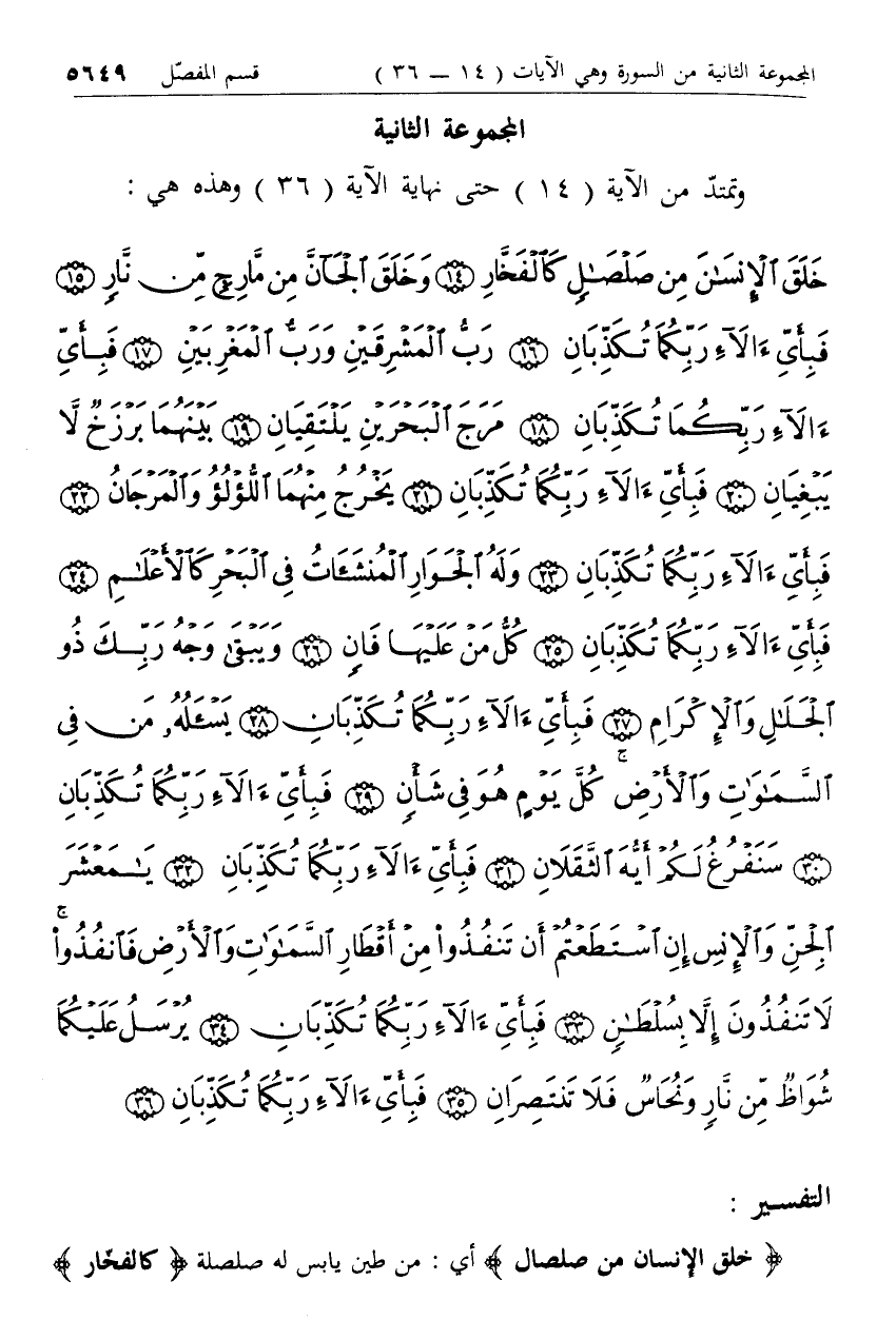 خَلَقَ الْإِنْسانَ مِنْ صَلْصالٍ كَالْفَخَّارِ (14) وَخَلَقَ الْجَانَّ مِنْ مارِجٍ مِنْ نارٍ (15) فَبِأَيِّ آلاءِ رَبِّكُما تُكَذِّبانِ (16) رَبُّ الْمَشْرِقَيْنِ وَرَبُّ الْمَغْرِبَيْنِ (17) فَبِأَيِّ آلاءِ رَبِّكُما تُكَذِّبانِ (18)