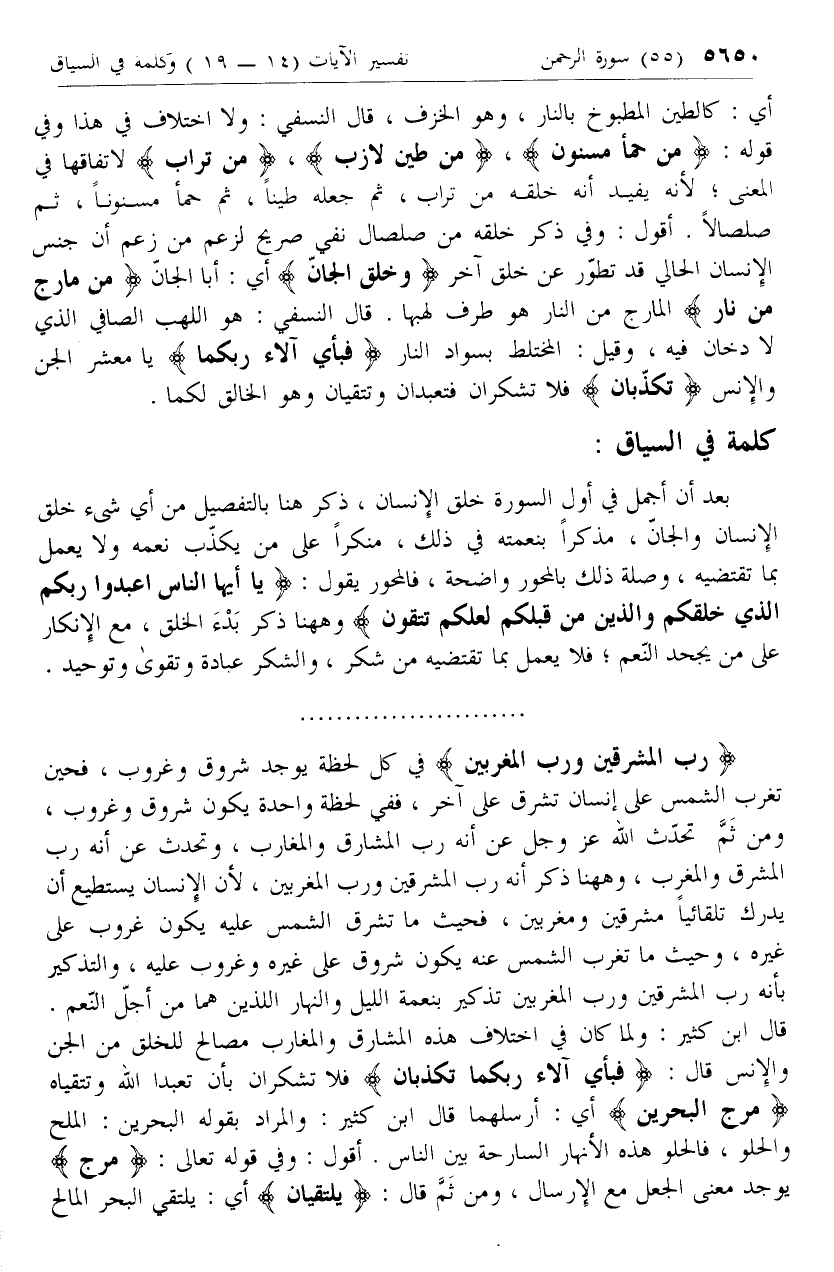 بعد أن أجمل في أول السورة خلق الإنسان، ذكر هنا بالتفصيل من أي شئ خلق الإنسان والجان، مذكرا بنعمته في ذلك، منكرا على من يكذب نعمه ولا يعمل بما تقتضيه، وصلة ذلك بالمحور واضحة، فالمحور يقول: يا أَيُّهَا النَّاسُ اعْبُدُوا رَبَّكُمُ الَّذِي خَلَقَكُمْ وَالَّذِينَ مِنْ قَبْلِكُمْ لَعَلَّكُمْ تَتَّقُونَ وهاهنا ذكر بدء الخلق، مع الإنكار على من يجحد النعم؛ فلا يعمل بما تقتضيه من شكر، والشكر عبادة وتقوى وتوحيد.
