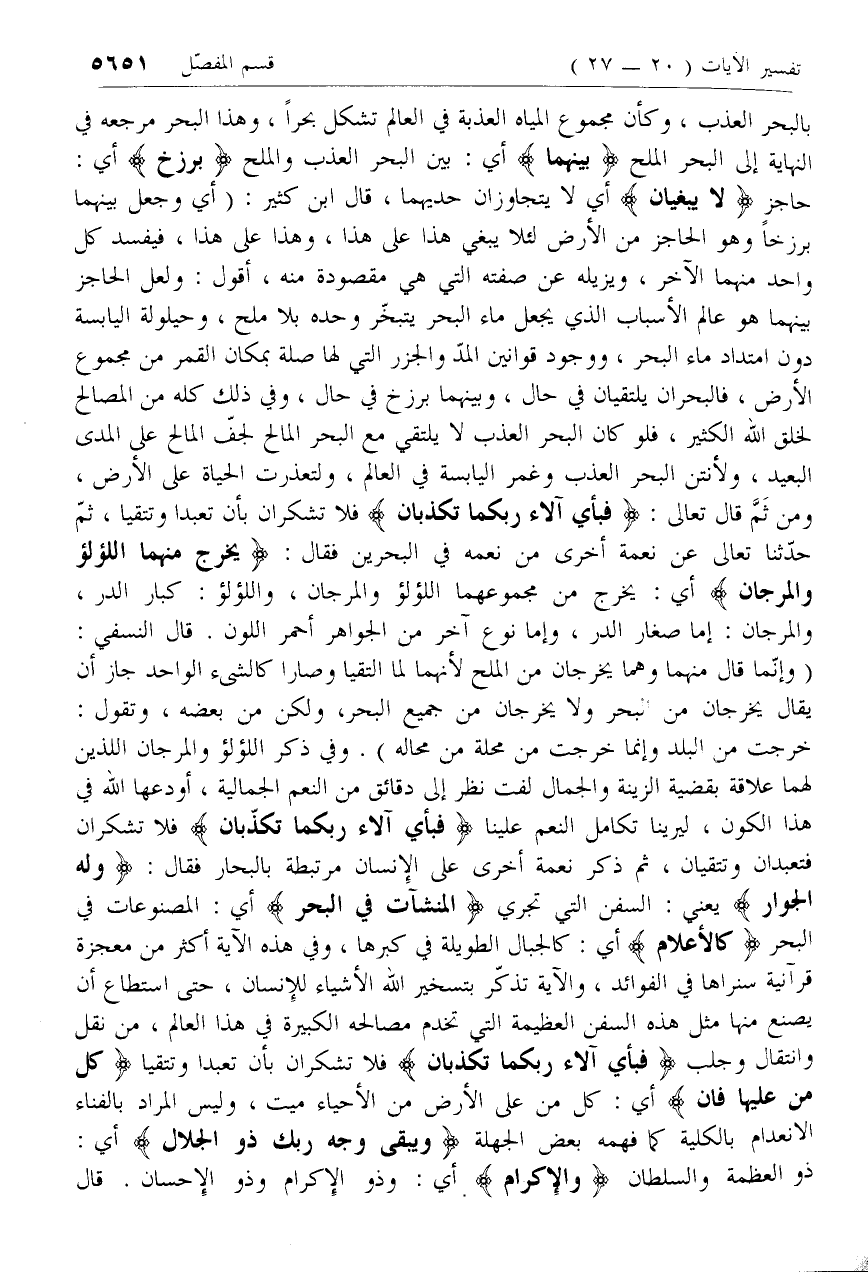 خرجت من البلد وإنما خرجت من محلة من محاله). وفي ذكر اللؤلؤ والمرجان اللذين لهما علاقة بقضية الزينة والجمال لفت نظر إلى دقائق من النعم الجمالية، أودعها الله في هذا الكون، ليرينا تكامل النعم علينا