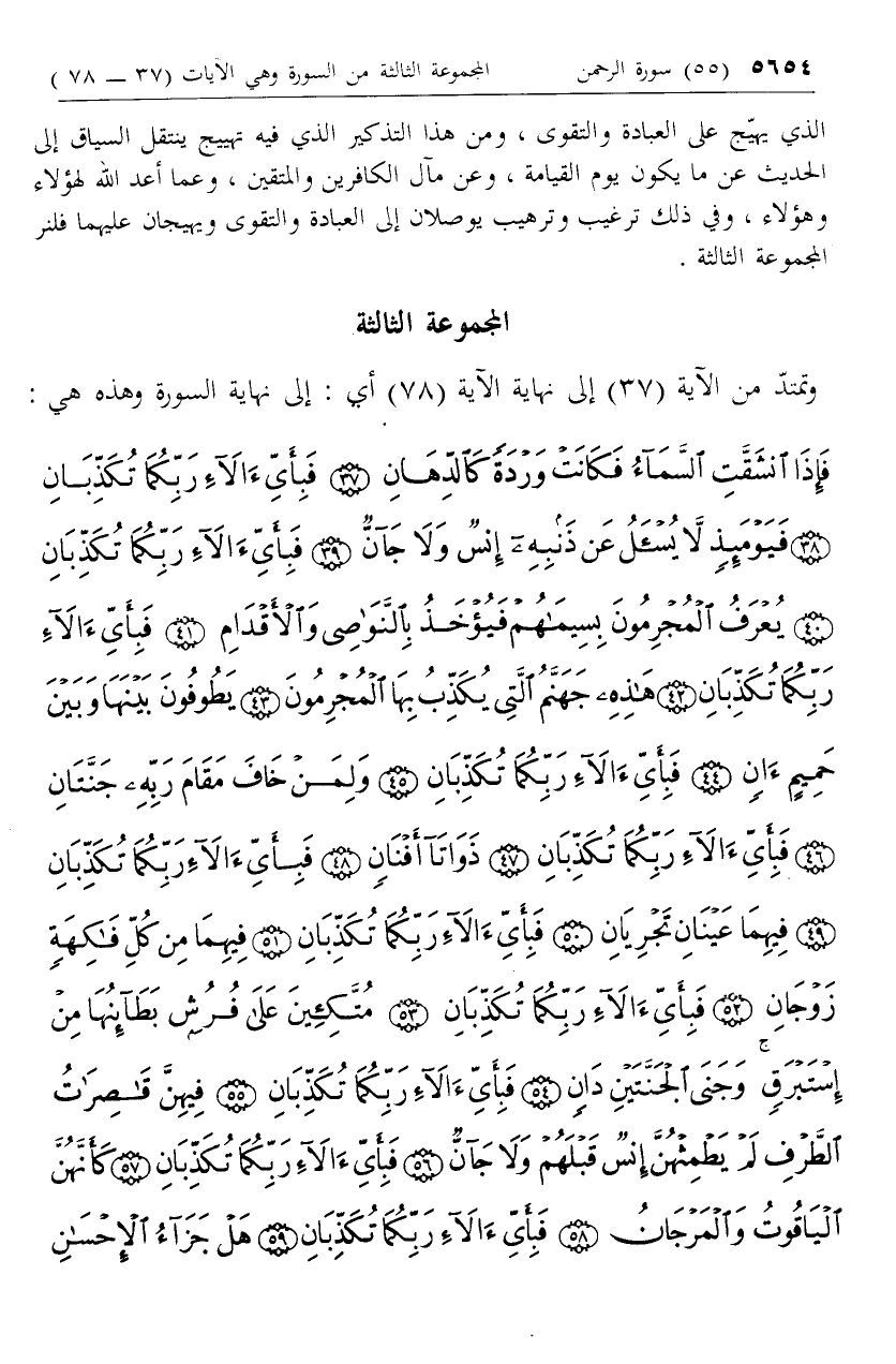 فَإِذَا انْشَقَّتِ السَّماءُ فَكانَتْ وَرْدَةً كَالدِّهانِ (37) فَبِأَيِّ آلاءِ رَبِّكُما تُكَذِّبانِ (38) فَيَوْمَئِذٍ لا يُسْئَلُ عَنْ ذَنْبِهِ إِنْسٌ وَلا جَانٌّ (39) فَبِأَيِّ آلاءِ رَبِّكُما تُكَذِّبانِ (40) يُعْرَفُ الْمُجْرِمُونَ بِسِيماهُمْ فَيُؤْخَذُ بِالنَّواصِي وَالْأَقْدامِ (41)